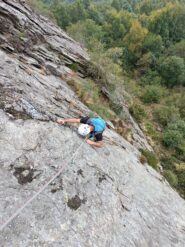 Via pulita e molto ben spittata ,avvicinamento solito per lo scudo striato , con tanto fogliame un po' scivoloso specialmente in discesa.