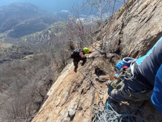 Materiale e soste ok.... roccia un po' "muschiata", accesso alla via comodo su sentiero e ultimi 5 minuti su pietraia...