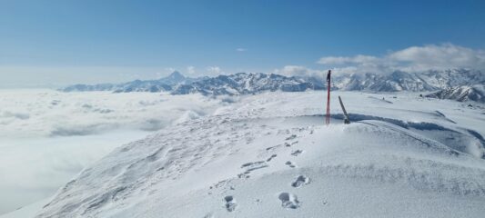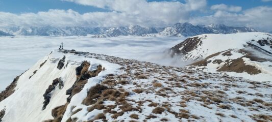 Partiti dal tornante dove inizia il sentiero per il colle della Roussa, imbiancato dalla leggera nevicata notturna, con il sole che buca la nebbia e…