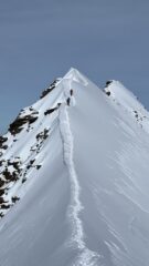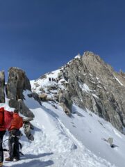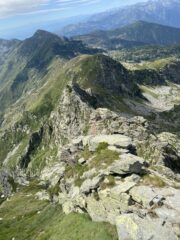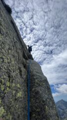 Partiti all’attacco della cresta poco sotto dove diceva la traccia, cresta molto larga si arrampica a tratti tra sfasciumi e buona roccia, pericolo di scariche…