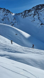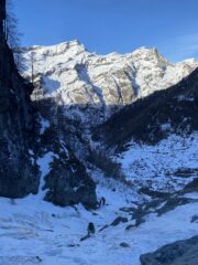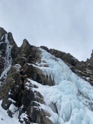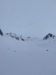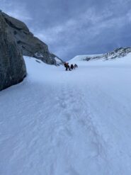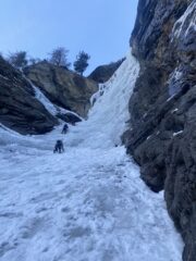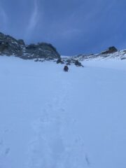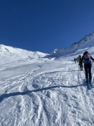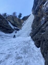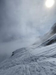 Avvicinamento molto comodo su una pista poi svoltare a destra e immettersi nel largo e comodo canale già stra battuto, primo tiro molto gradinato ma…
