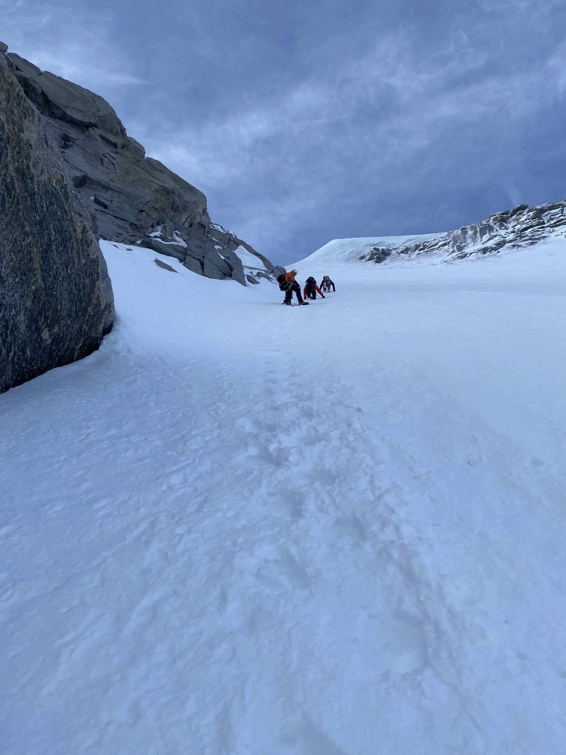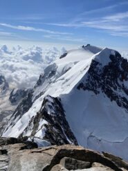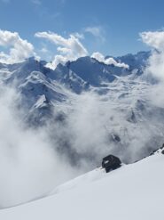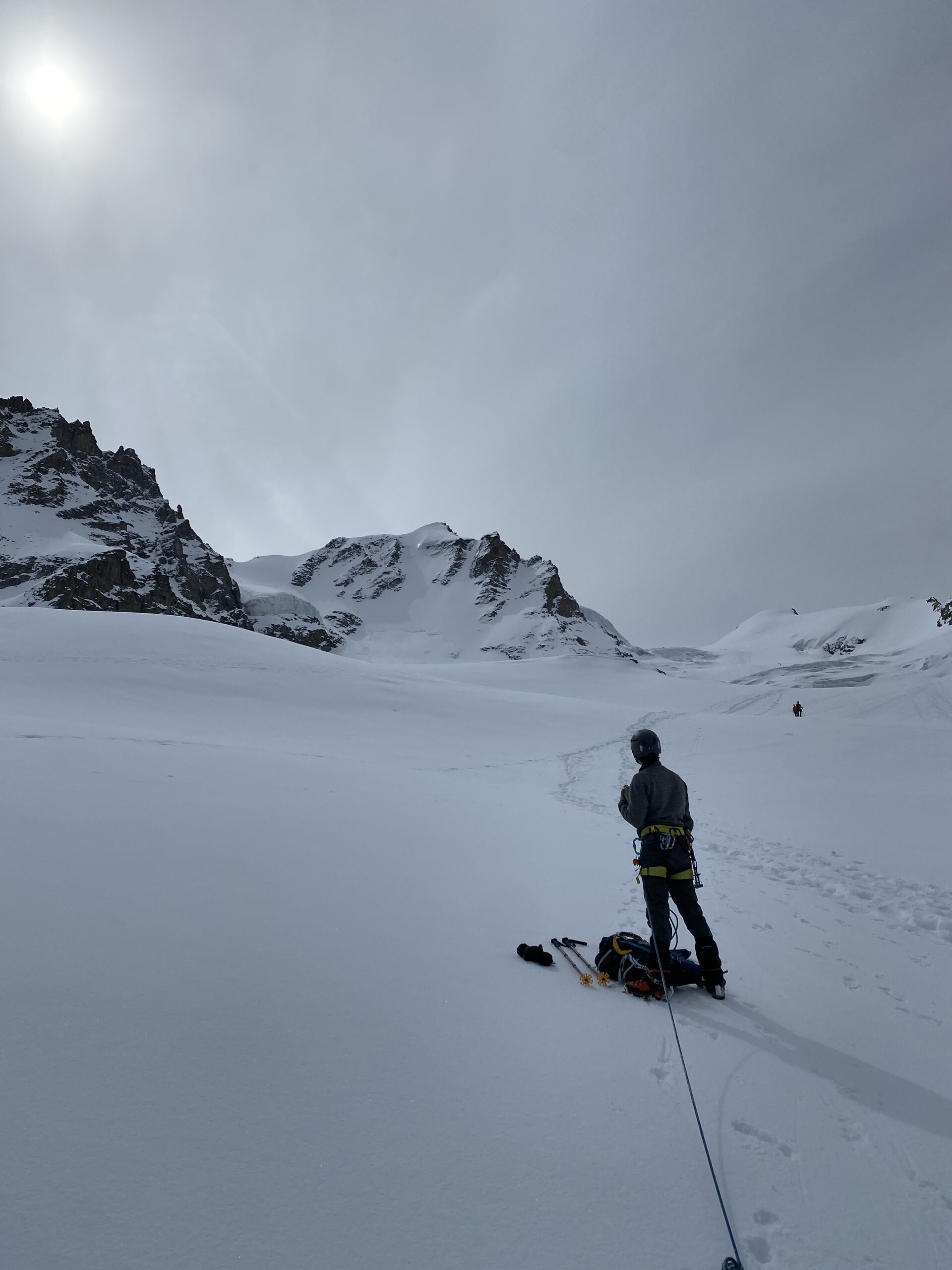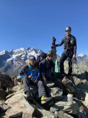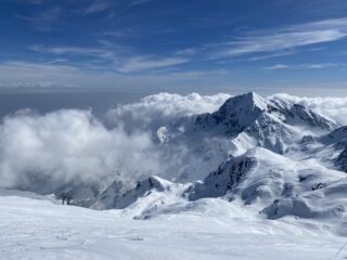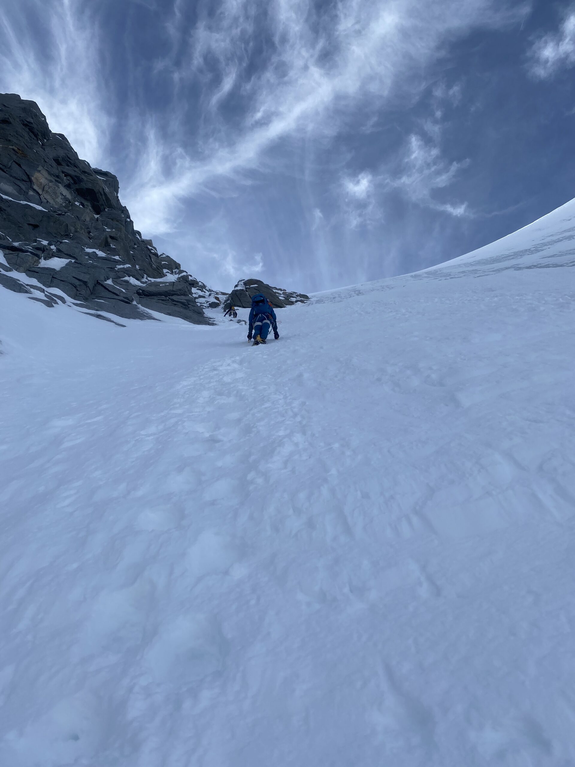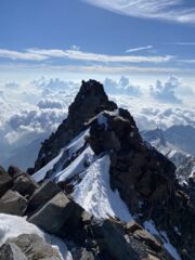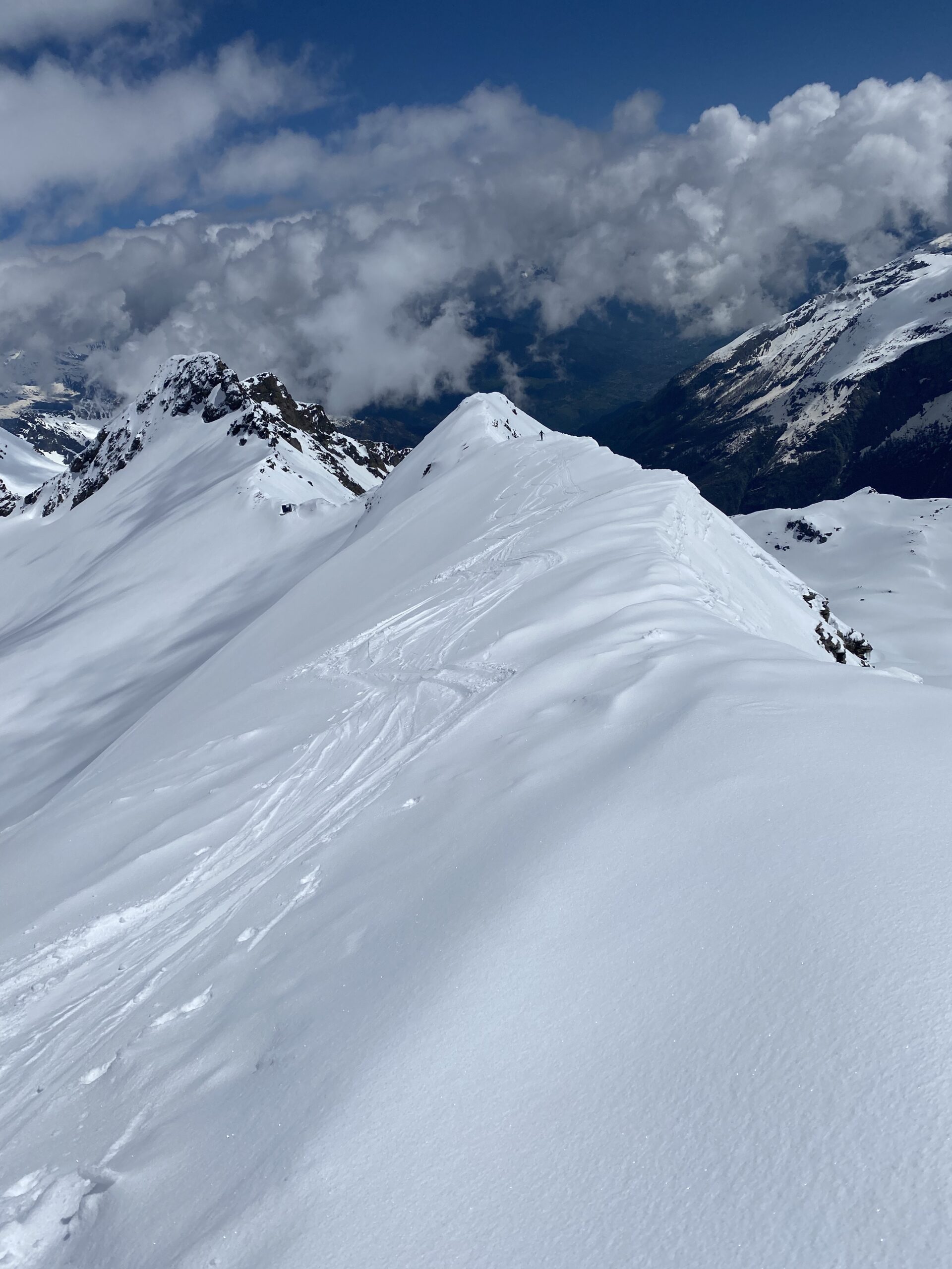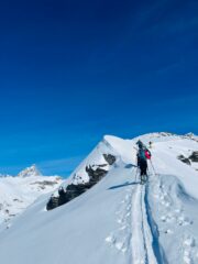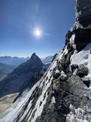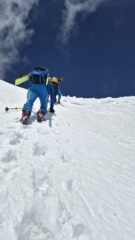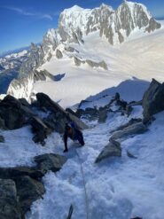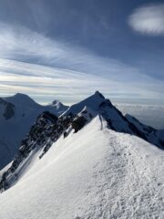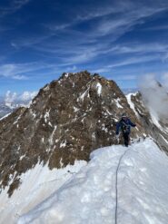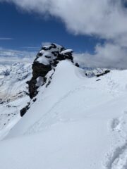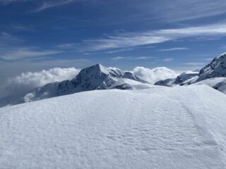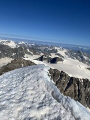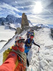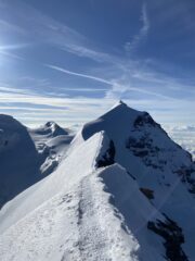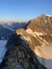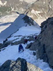 Condizioni della cresta asciutte e senza verglass, neve ben rigelata al mattino, crepacci tutti chiusi, occhio al canale con le catene scariche di pietre assicurate,…