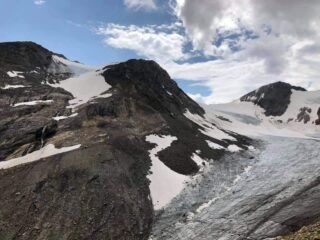 Qlc nevaio, in piano, tra il P.so del Gries e il P.so Corno, ma facilmente attraversabili anche con scarpette da trail. Tutto come da descrizioni precedenti. Faticosetto…