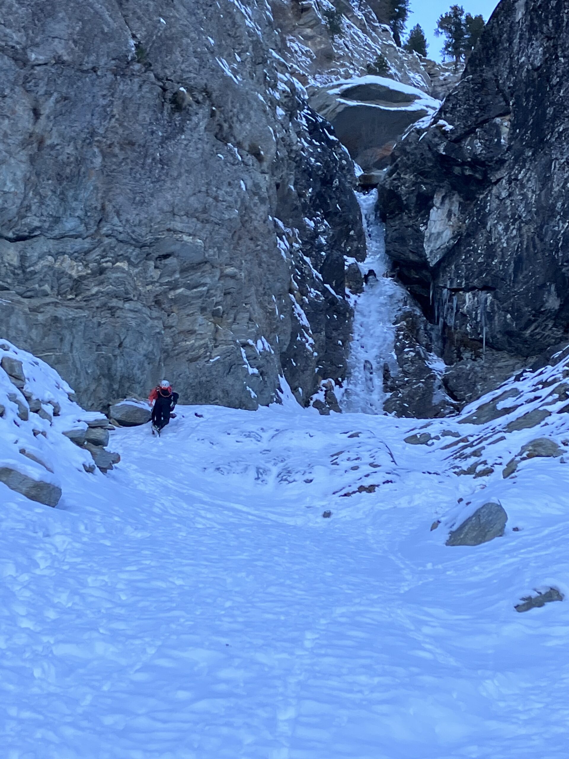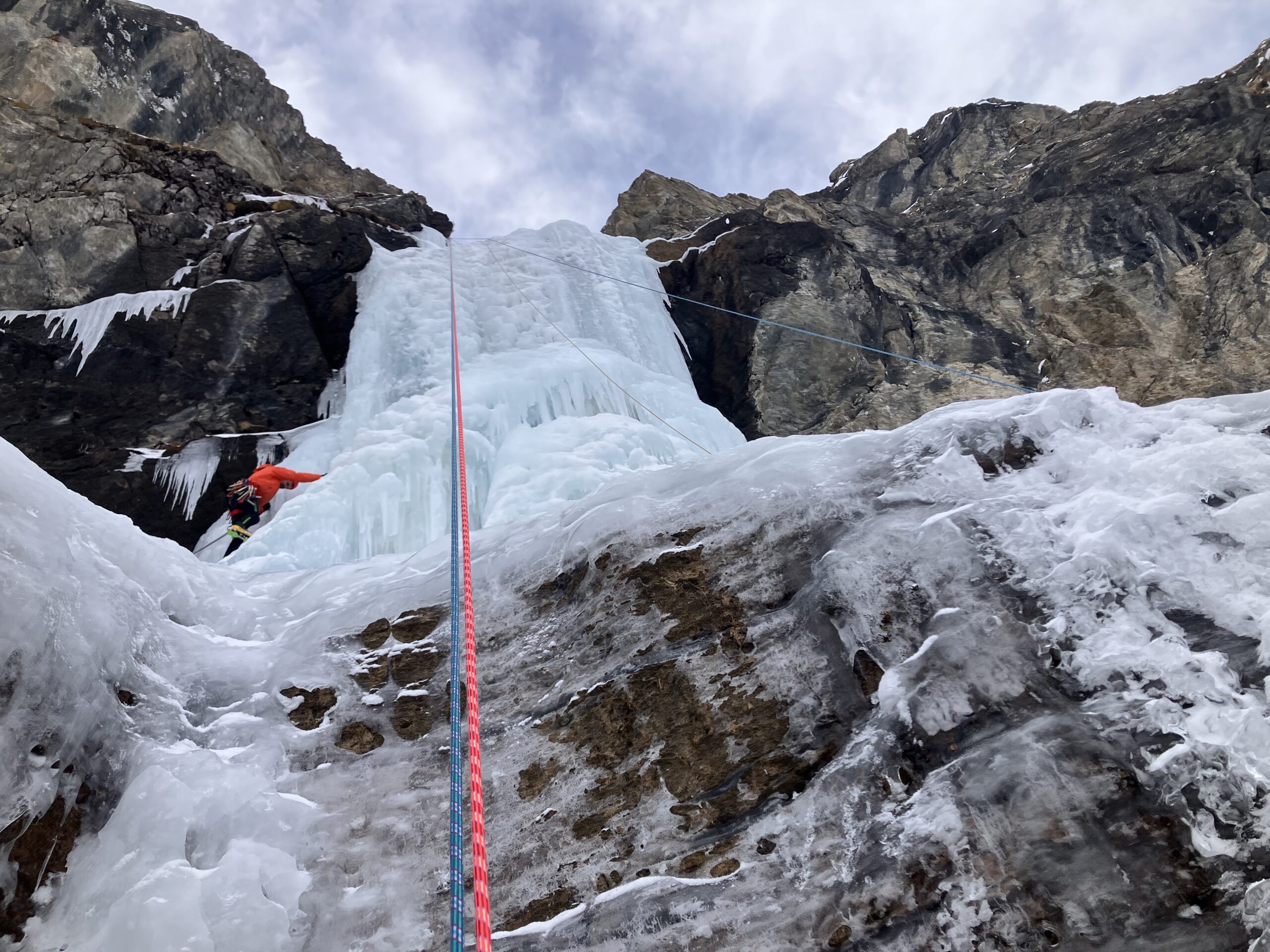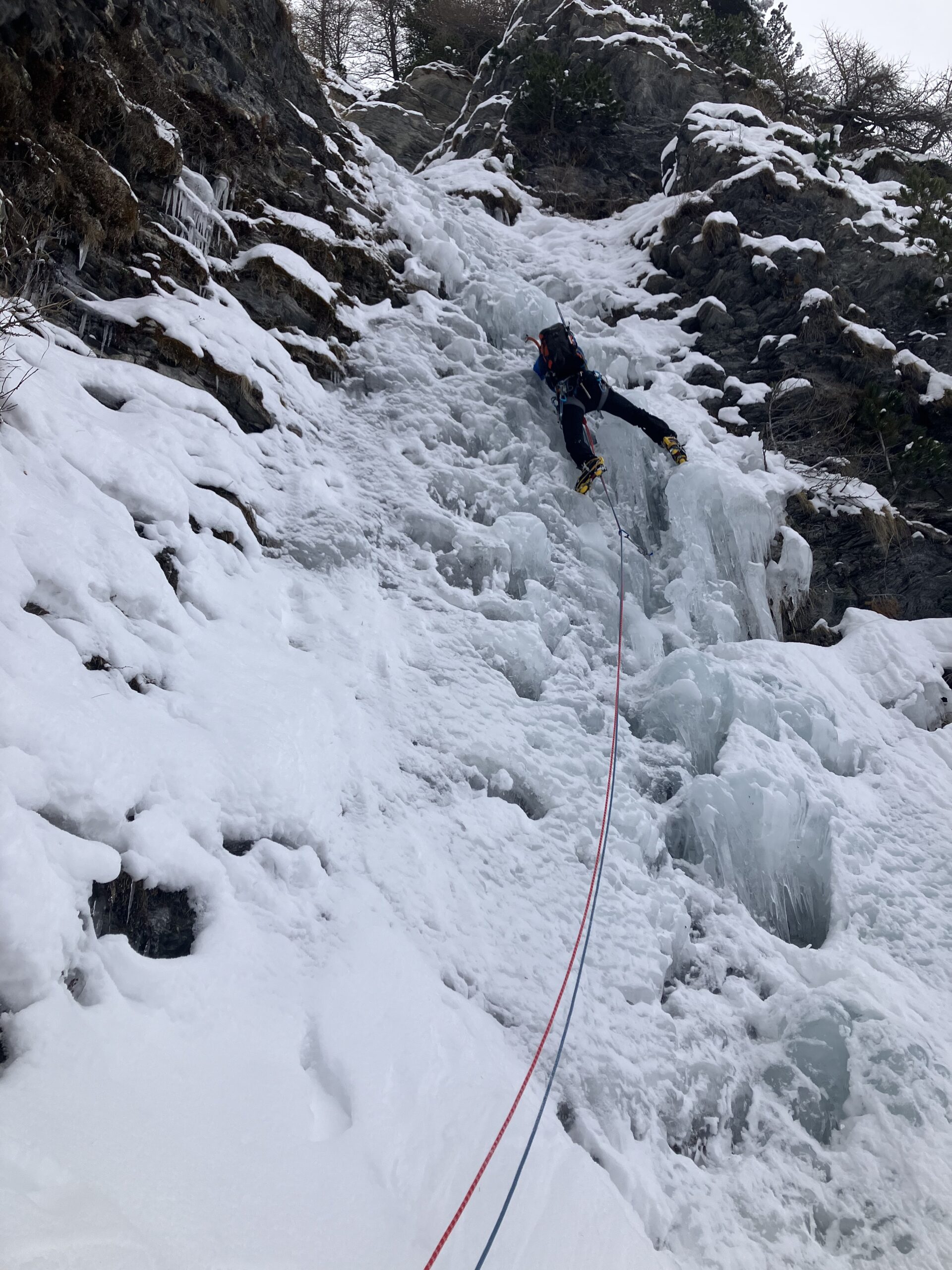 Avvicinamento di 10 minuti, la cascata è visibile dalla strada. L1 di riscaldamento, con pendenza moderata. L2 con partenza su traverso ascendente verso destra e…