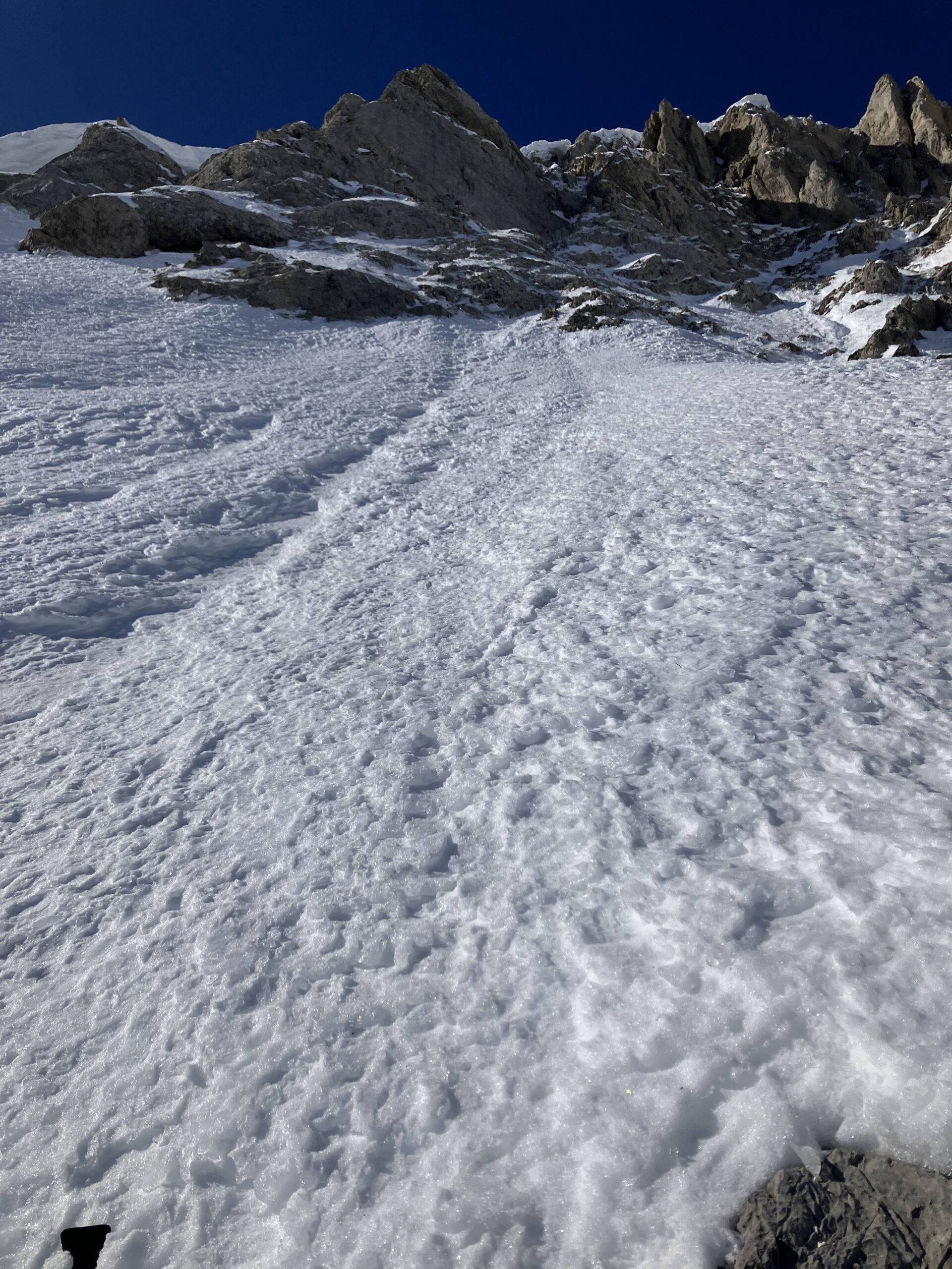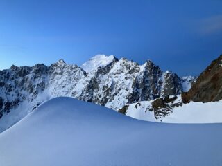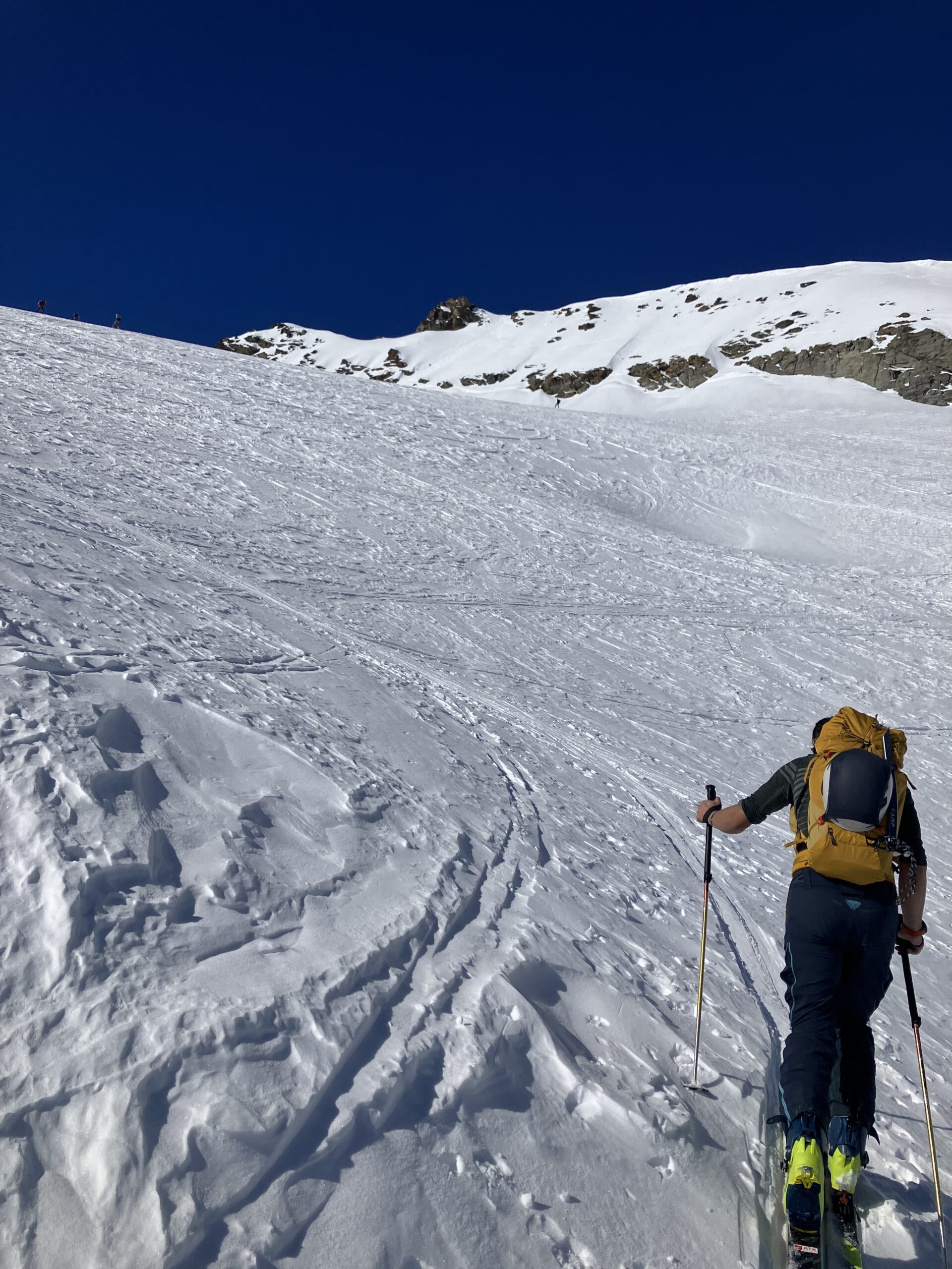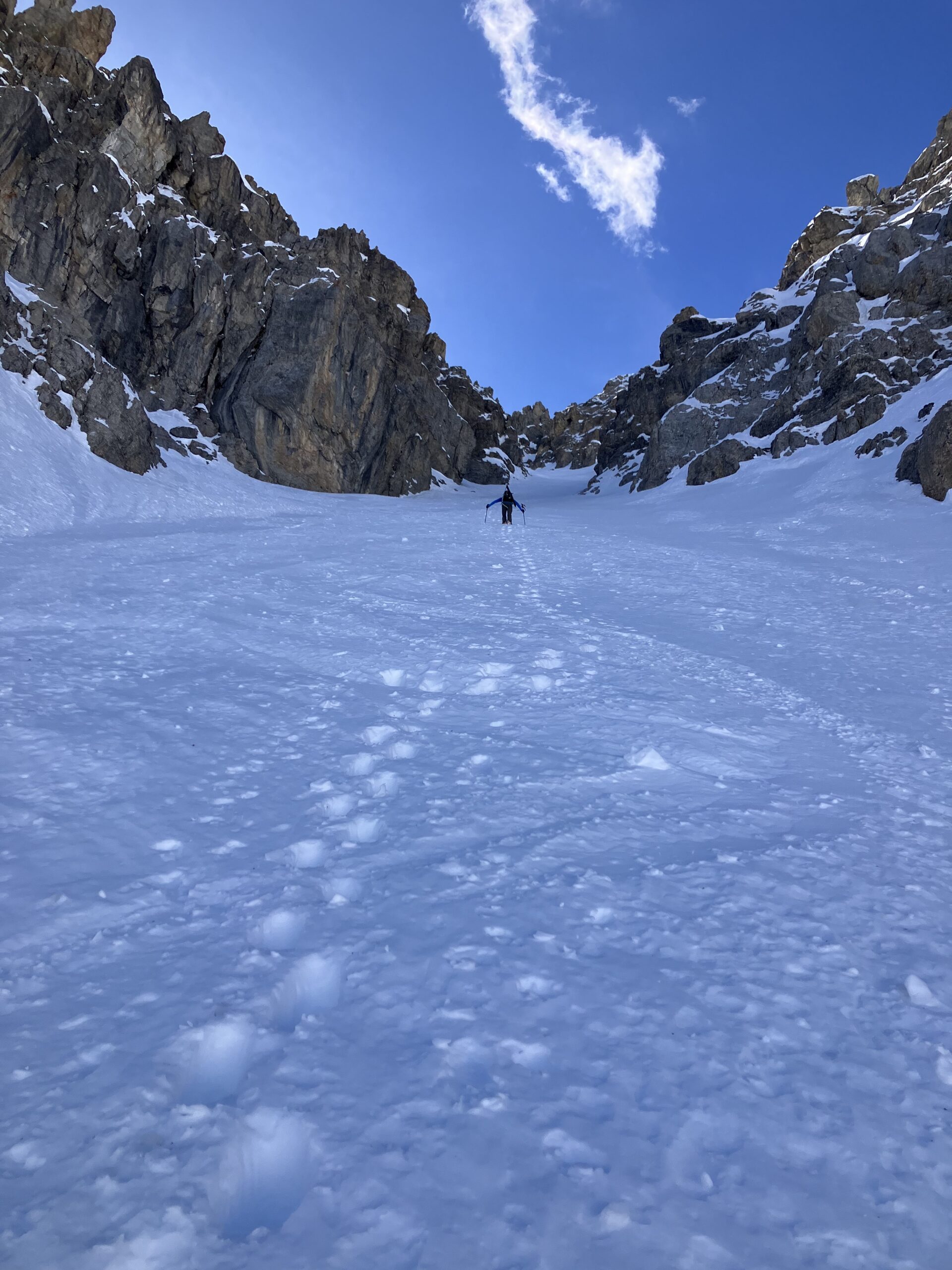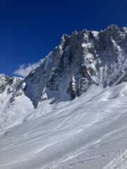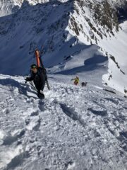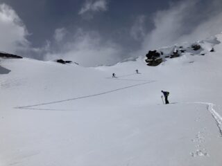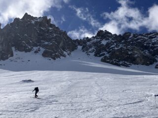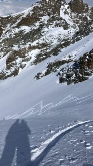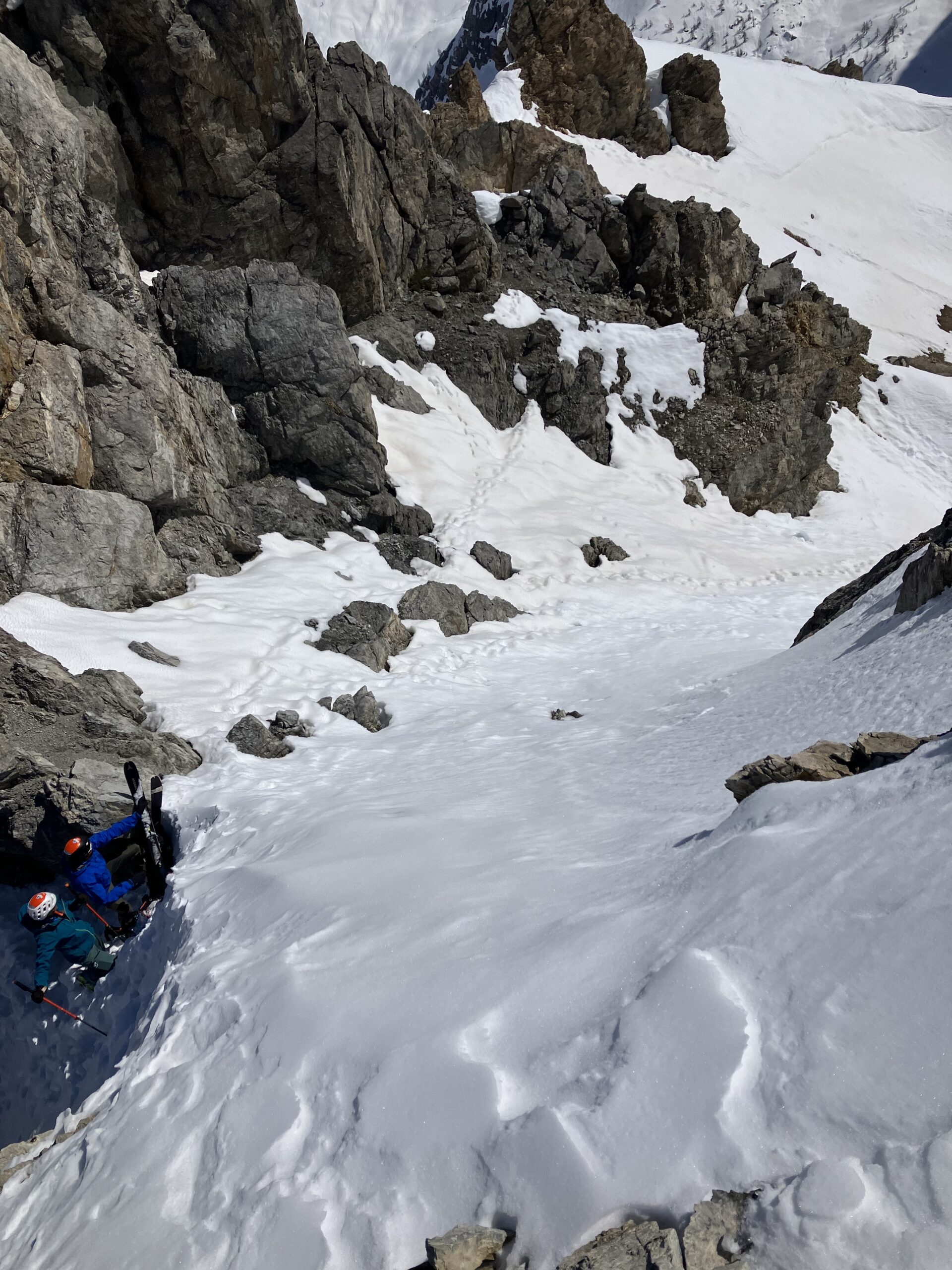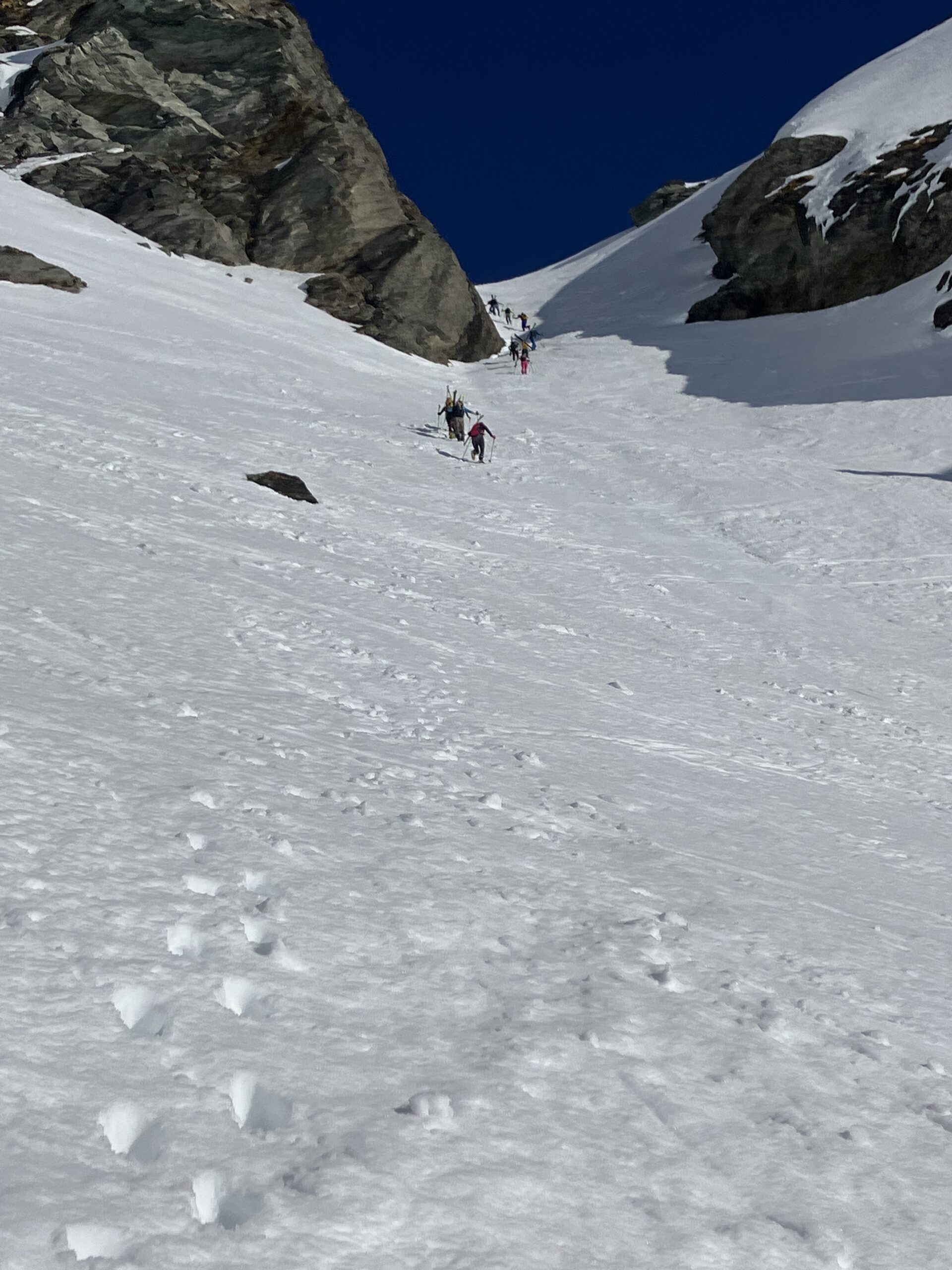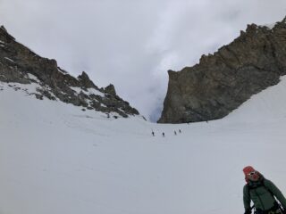 Partenza da Bonne sci ai piedi con parecchio traffico fino all’Arp Vieille e buon rigelo notturno. Saliti su crosta portante per il canalino SO con…
