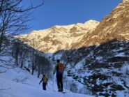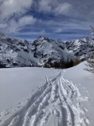 Primo tratto di sentiero da fare con gli sci in spalla. Dalla mulattiera la neve continua permette di procedere sci ai piedi. Buon innevamento in…