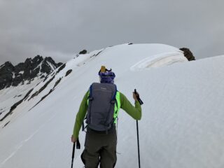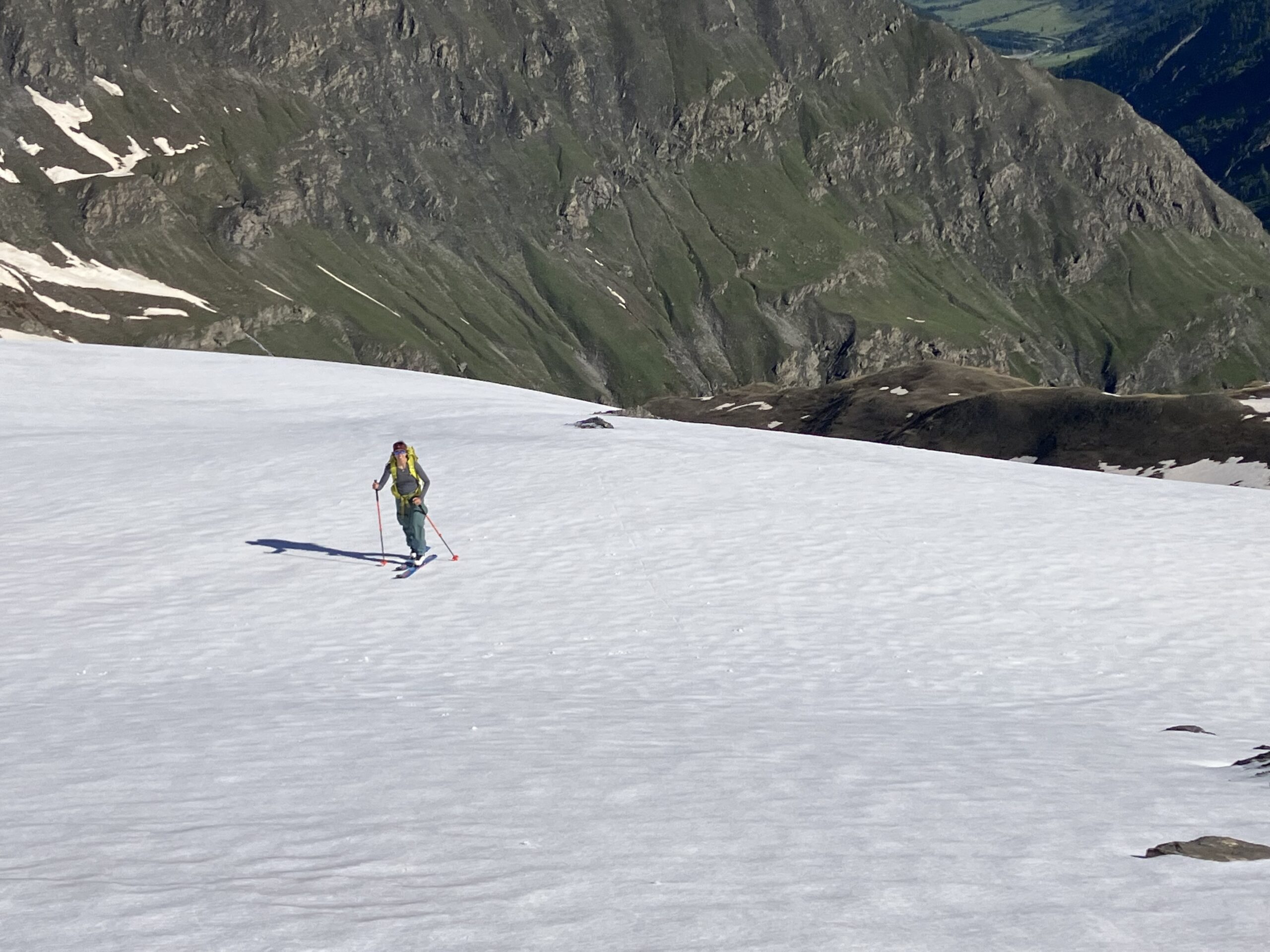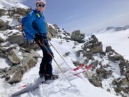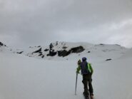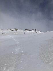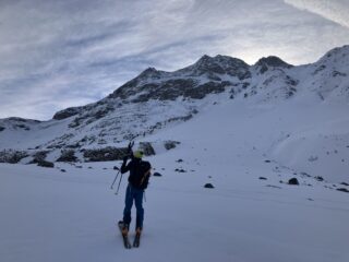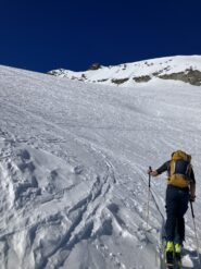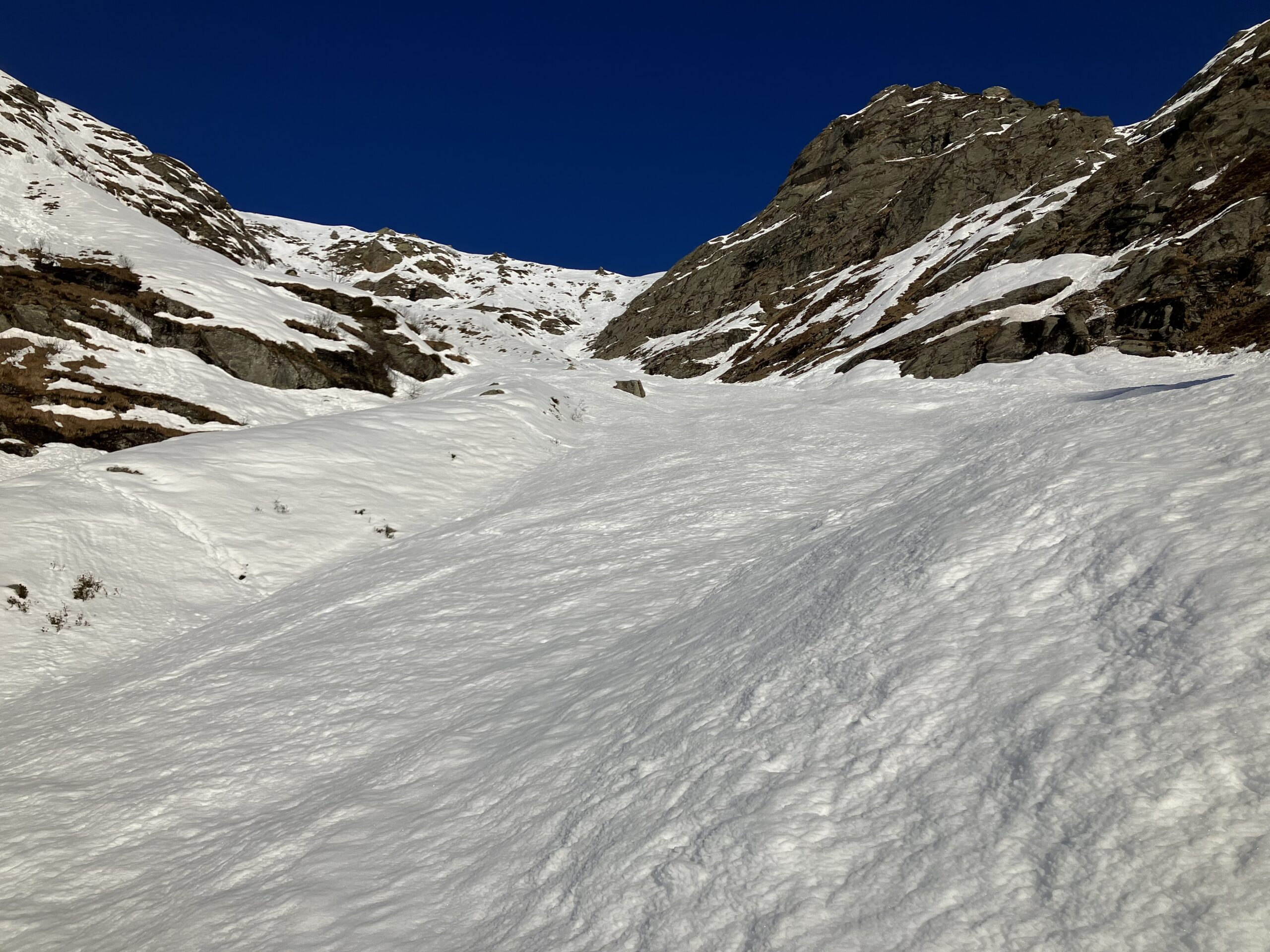 Partenza sci ai piedi dove si ferma la strada del Gran San Bernardo con dubbio rigelo durante la notte. Attaccato il colle di Saint Remy…