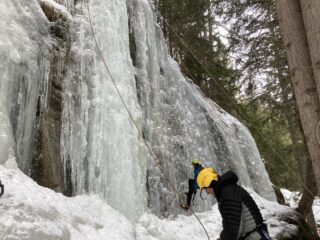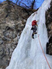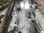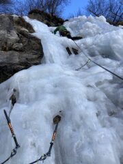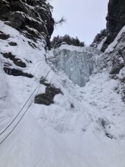 Cascata salibile in sicurezza ma non ancora in condizione. Un po’ di vento fino a Pian Ceiol e poi ben riparati in cascata, in alto…