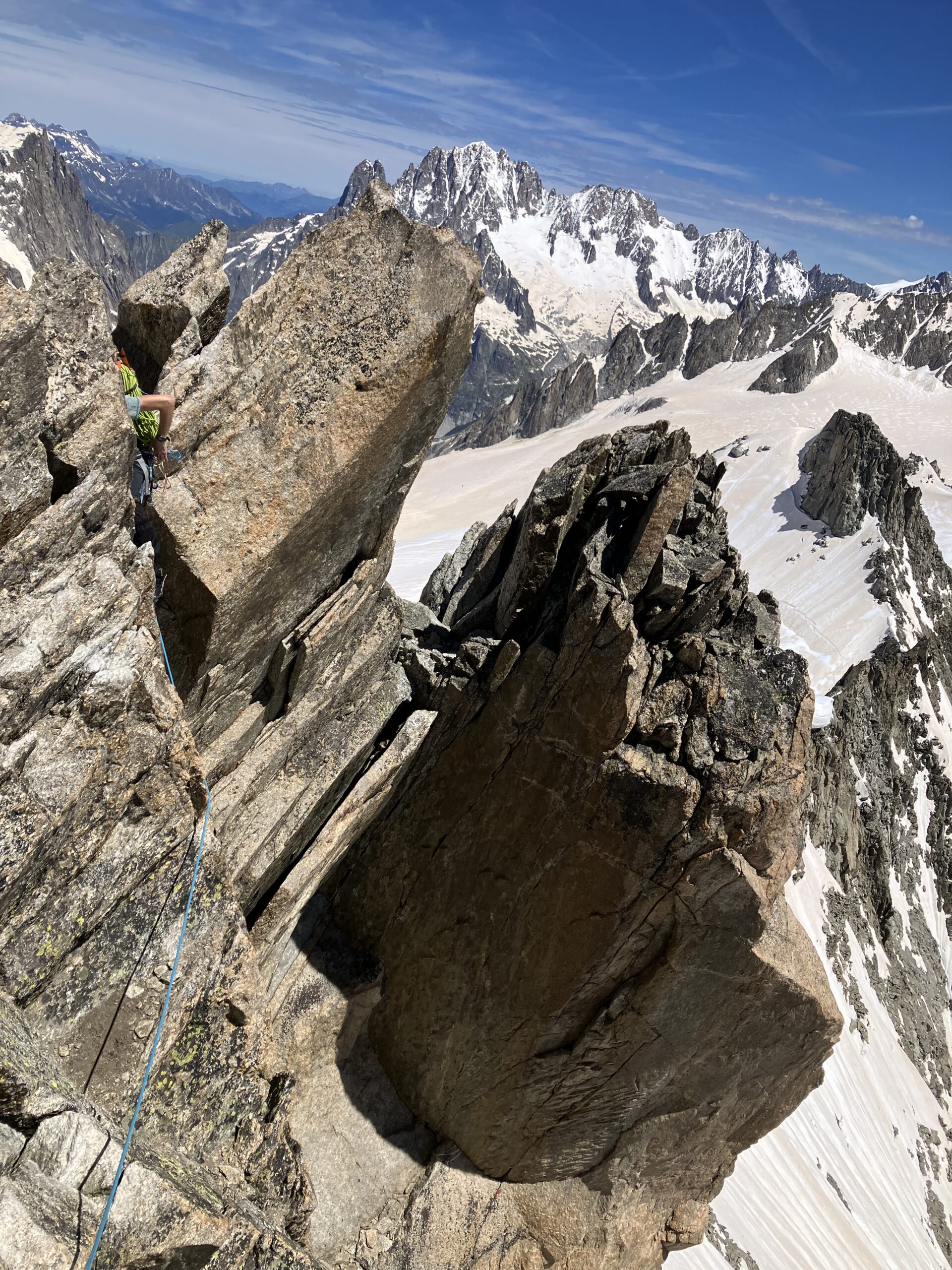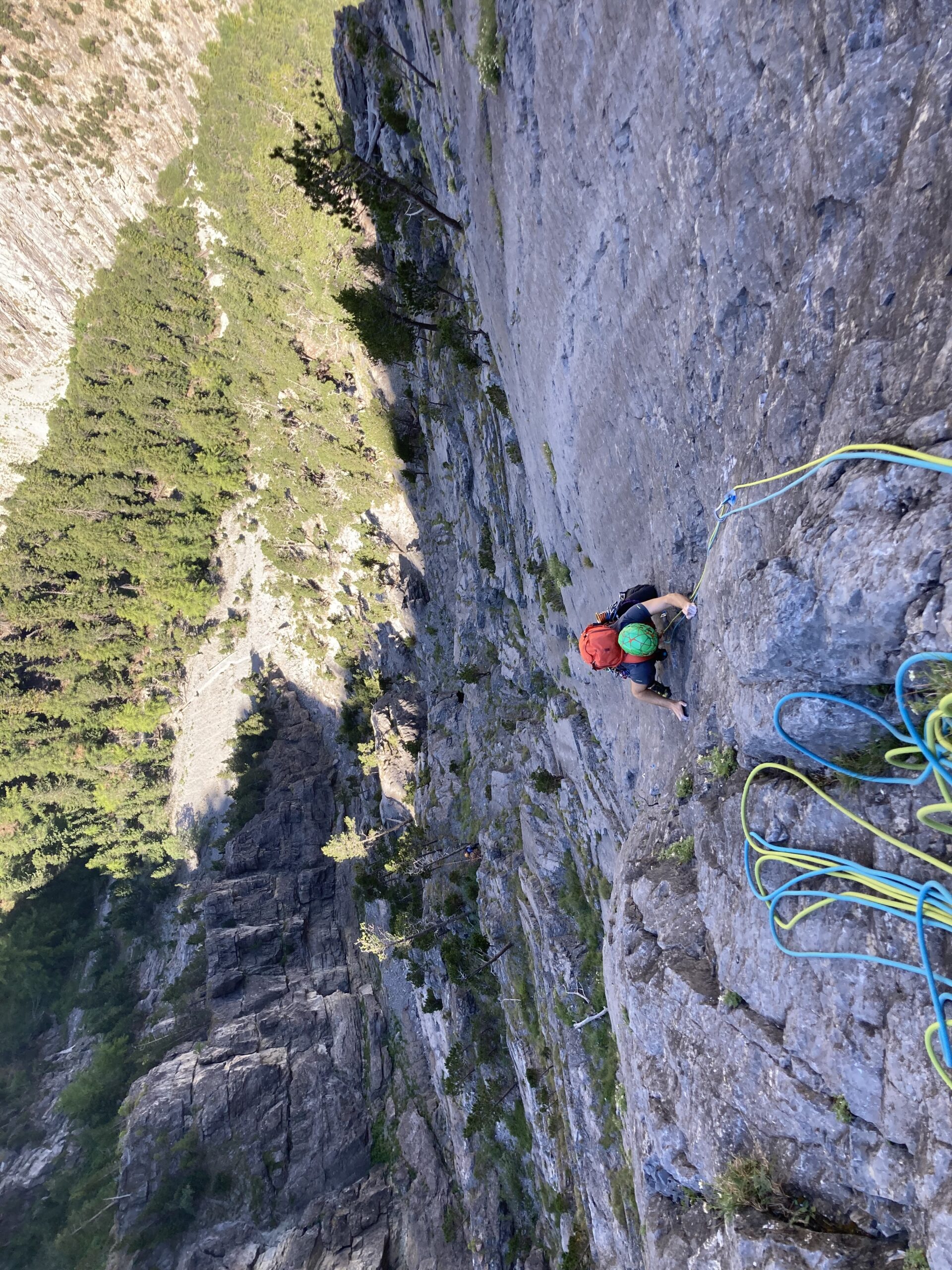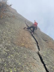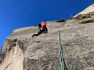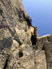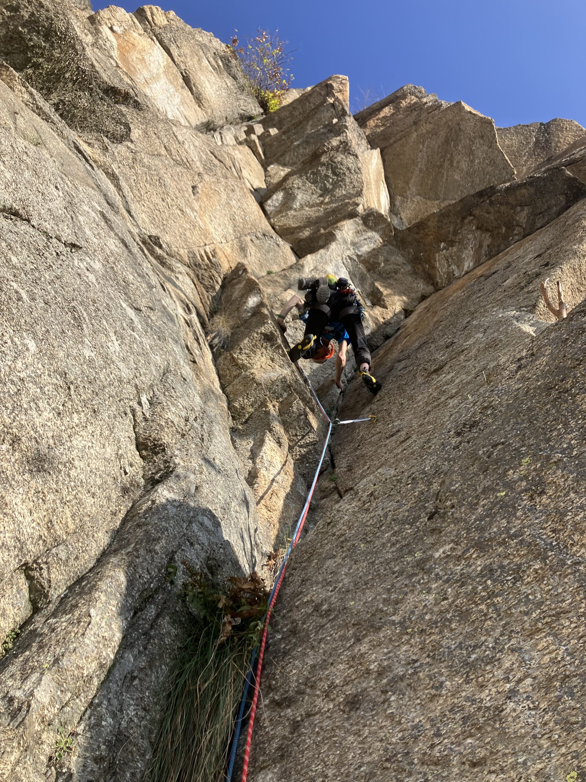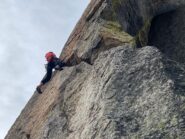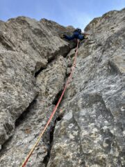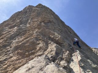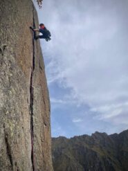 Via stupenda, veramente completa tra placche, diedri e fessure trad, tettini e tallonaggi su roccia ottima. Unito L2-L3 e L14 (finger crack)-L15 senza particolari attriti.…