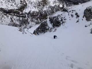 Gita di ripiego visto la forte inversione termina con vento da sud che ci ha fatto abbandonare la cascata “disperazione dell’etica”. Conoide completamente senza neve…