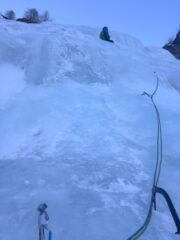 Divertente falesia di ghiaccio con tiri di varie difficoltà. Più impegnativi quelli a sx. Possibilità di montare la sosta dall’alto su albero. Cascata ben formata…