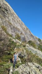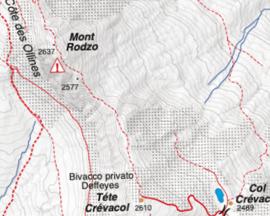 A centro parete c'è il tiro di IV- | vigiutribula | L'estetica cresta | vigiutribula | Dalla sosta dell'ultimo tiro | vigiutribula | L'attacco della via ad oggi | vigiutribula | L'accesso al ghiaccio | vigiutribula | Il punto in cui sono segnato i nomi delle due vie presenti. | vigiutribula | | vigiutribula | In verde la traccia di salita, in rosso la linea di discesa nel canale | vigiutribula | L'imbocco del canale | vigiutribula | Dettagliocartina con la quota 2577 da cui parte il canale