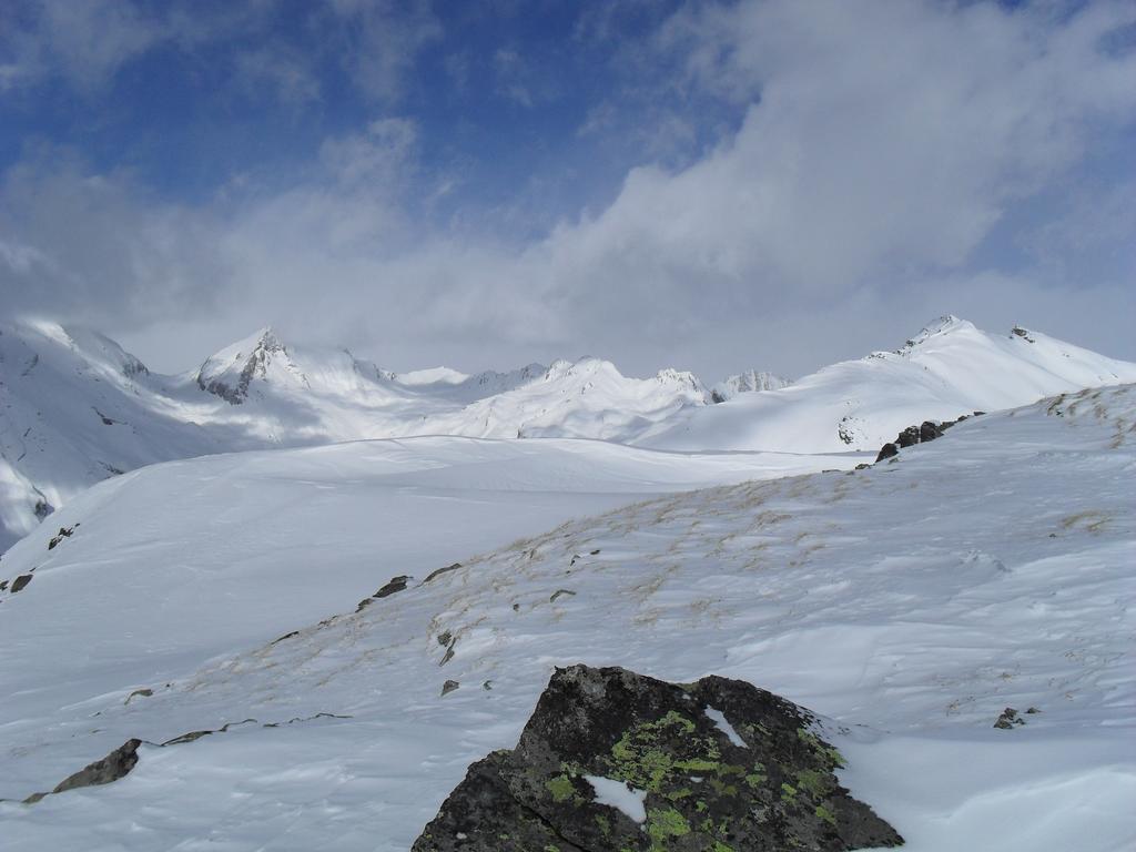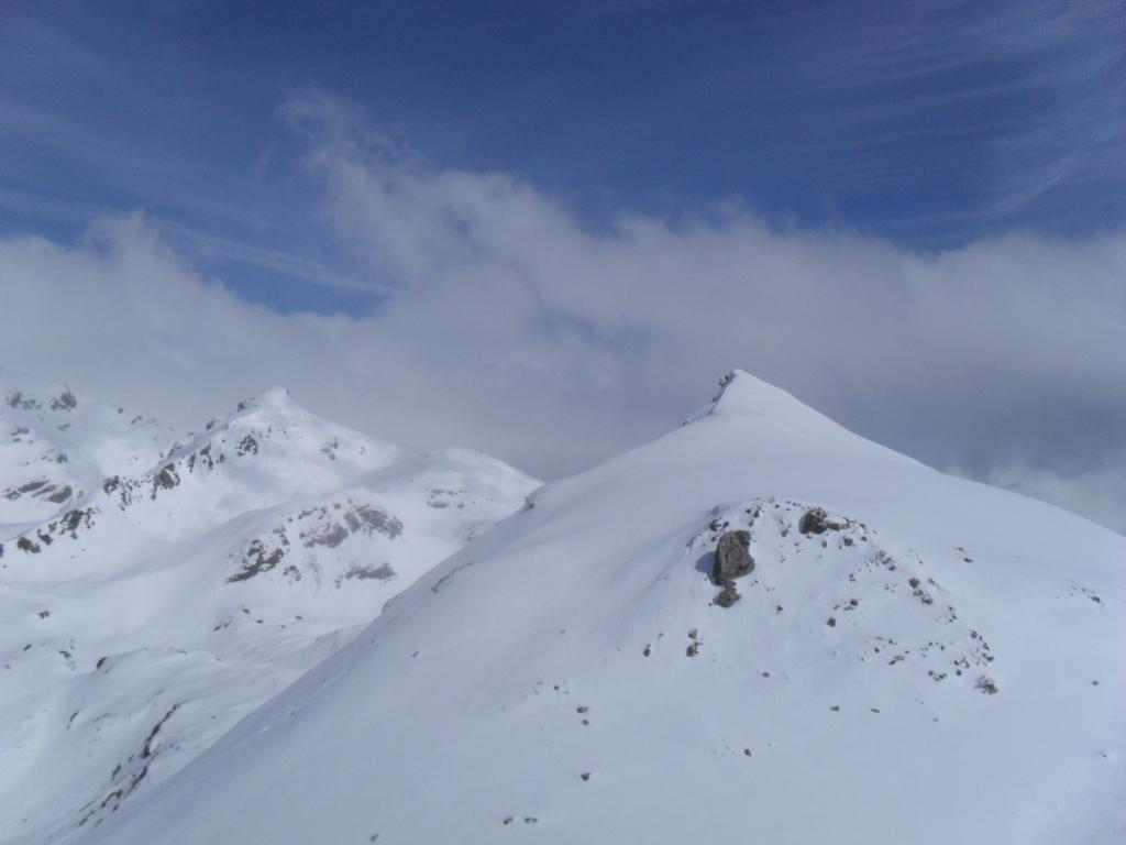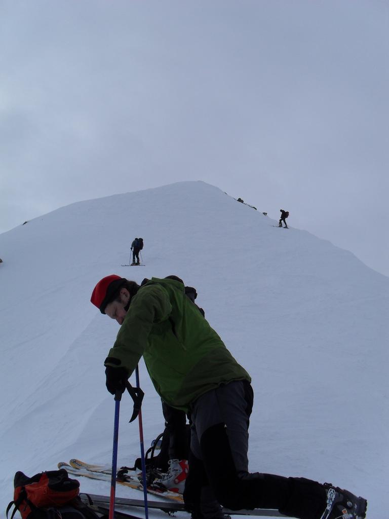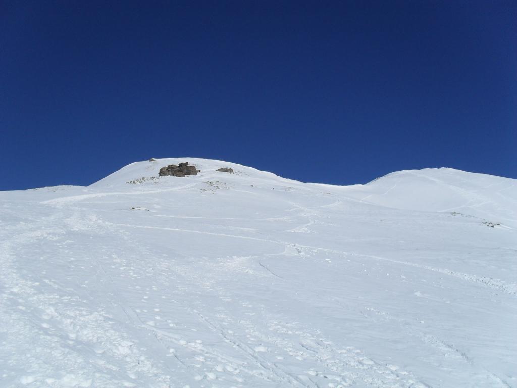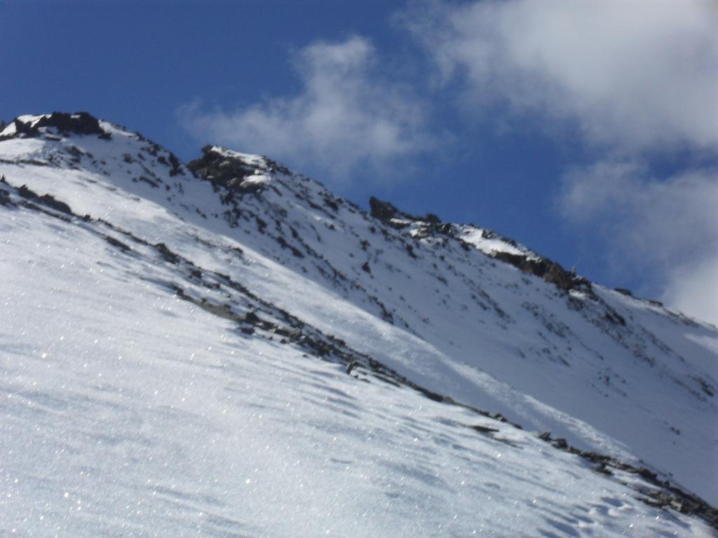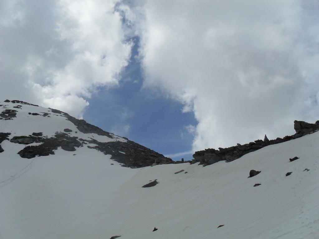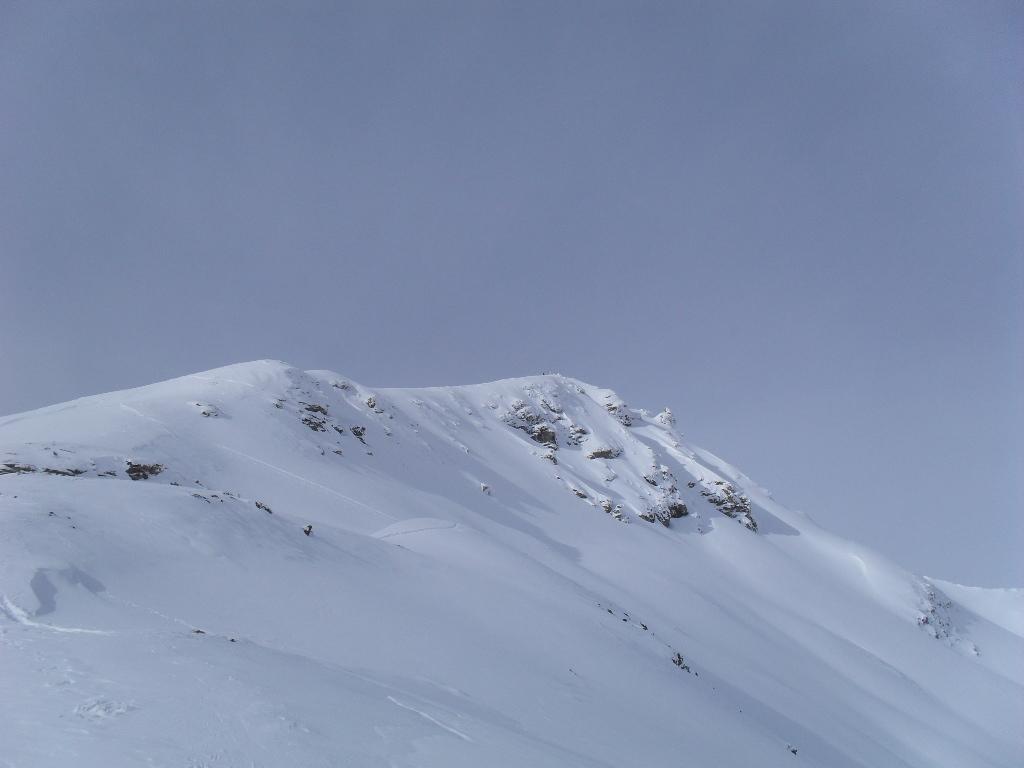 | vipi5547 | L'anticima dove si preparano gli sci per la discesa | vipi5547 | panorama e cielo velato da nuvole alte | vipi5547 | a destra l'inizio della discesa