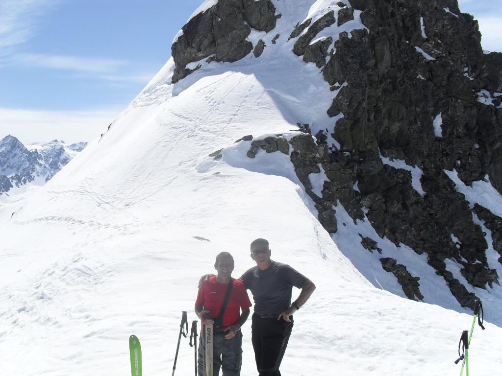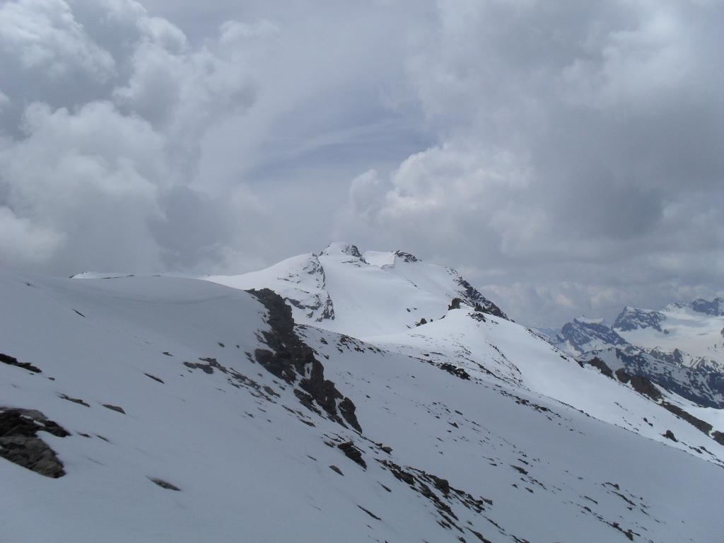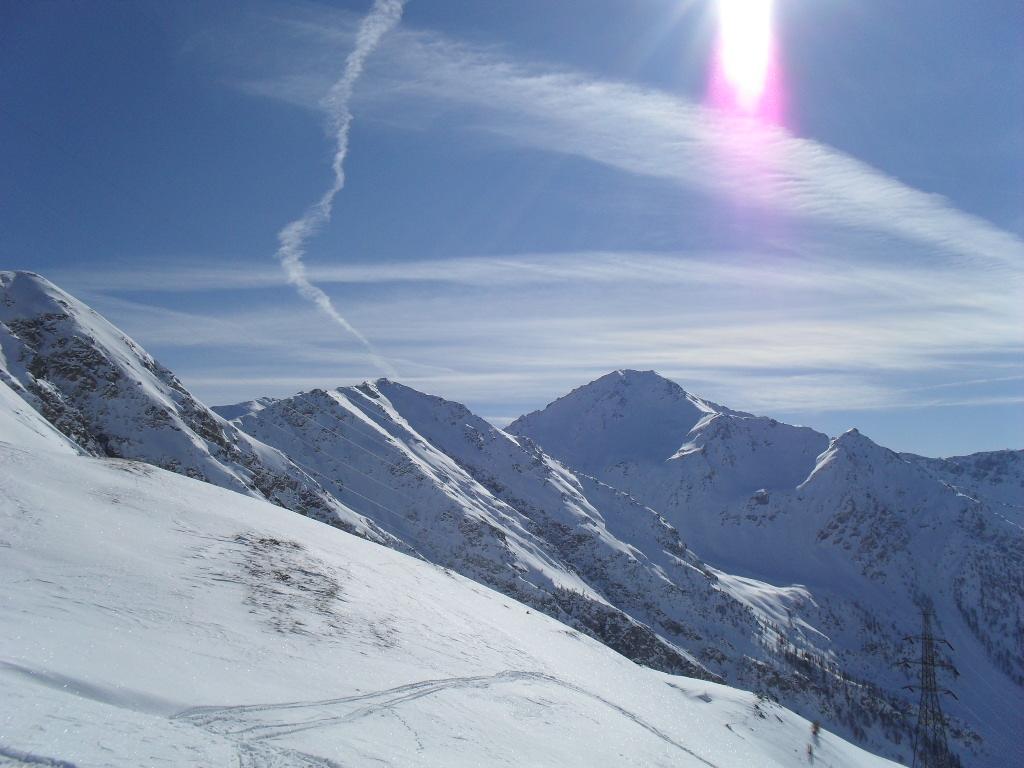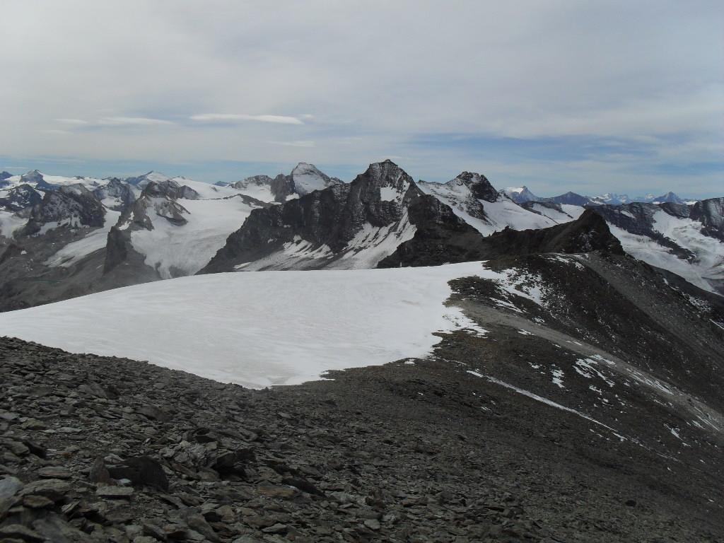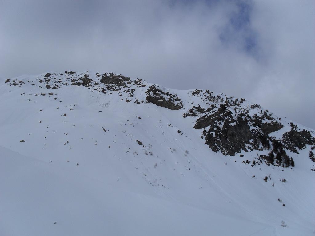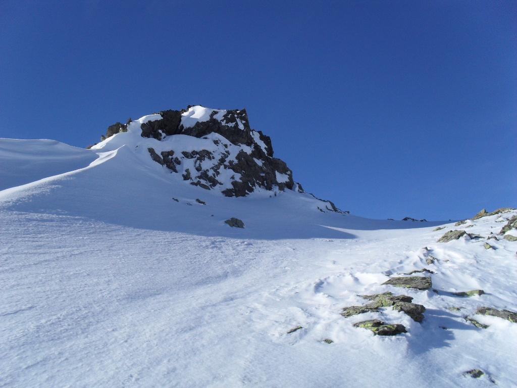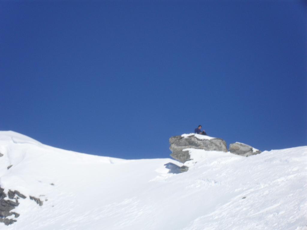 | vipi5547 | L'anticima dove si preparano gli sci per la discesa | vipi5547 | panorama e cielo velato da nuvole alte | vipi5547 | a destra l'inizio della discesa