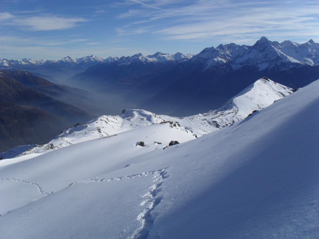 | vipi5547 | particolare nel bosco | vipi5547 | la vetta e' vicina | vipi5547 | in vetta | vipi5547 | panorami verso Aosta | vipi5547 | panorama verso il Cervino e l'Emilius | vipi5547 | inizio della discesa | vipi5547 | le firme nel canale di discesa