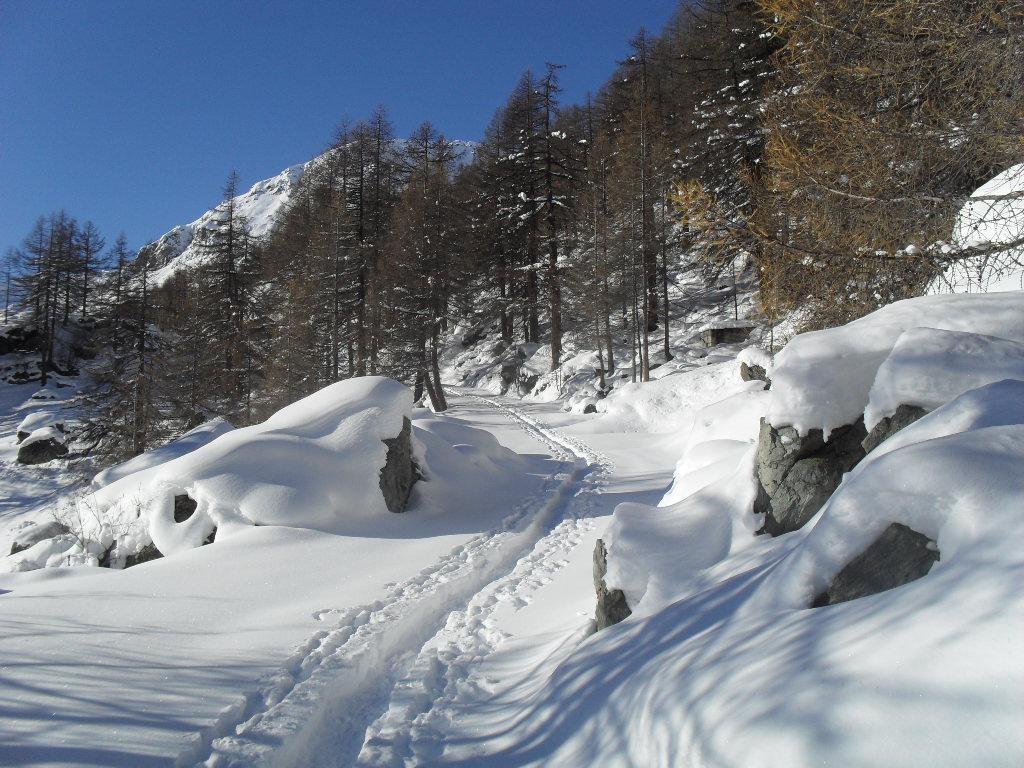 | vipi5547 | in neve intonsa all'inizio del bosco | vipi5547 | all'uscita dal bosco | vipi5547 | in vista dell'alpe Flassin dove inizia ad arrivare il sole | vipi5547 | l'ambiente sopra l'alpe Flassin | vipi5547 | sopra l'alpe Flassin,sullo sfondo il Cervino