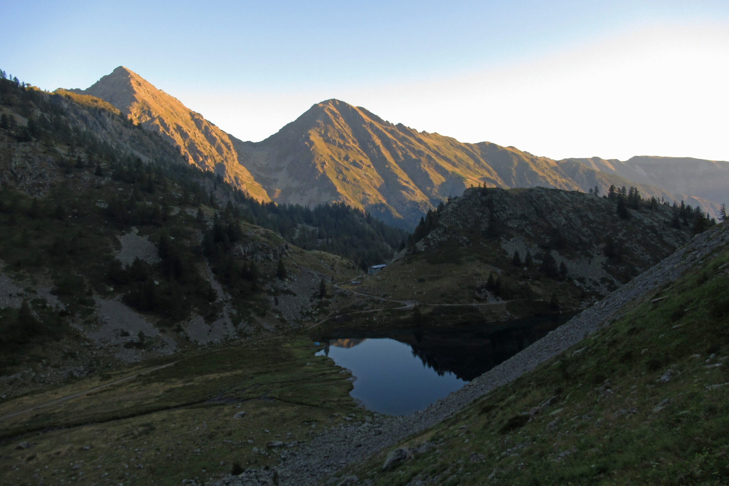 | volibear | Salendo nel vallone Guercia, vista su lago San Bernolfo e alba su Laroussa | volibear | Ometto di vetta e panorama su Corborant, Giofreddo e Laroussa | volibear | Secondo laghetto innominato nel vallone Gorgia dei Laghi