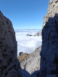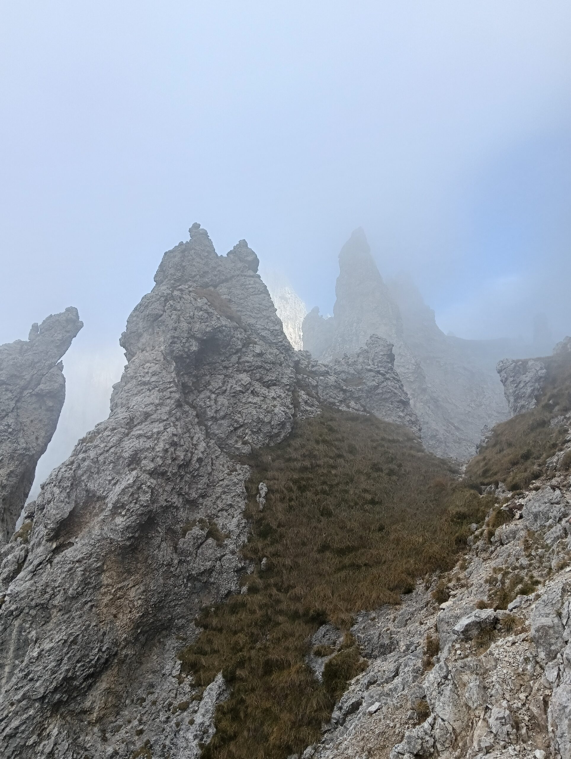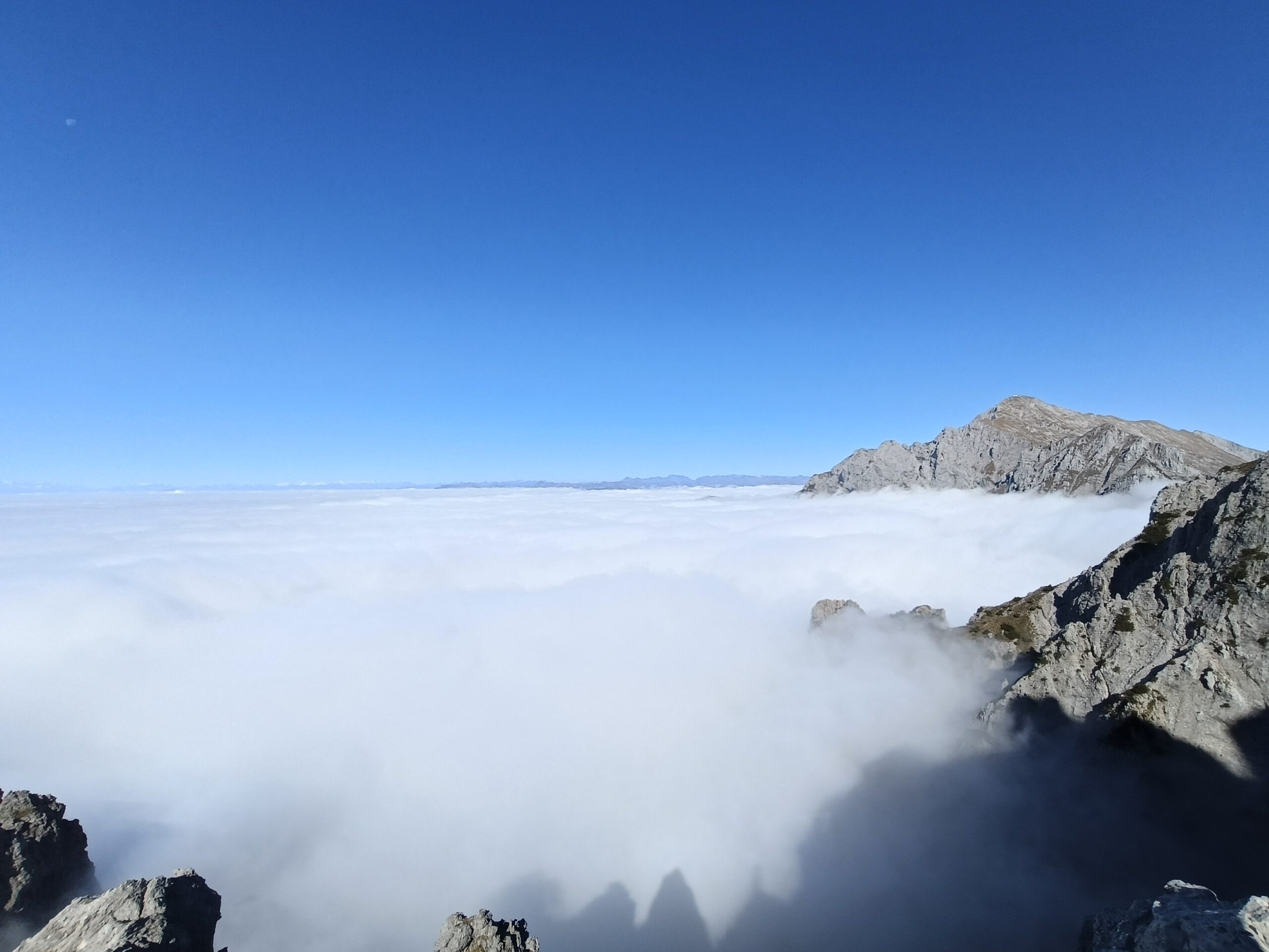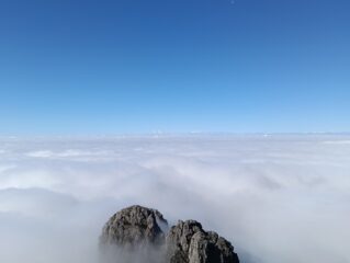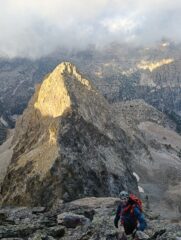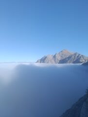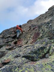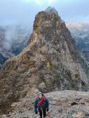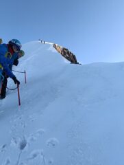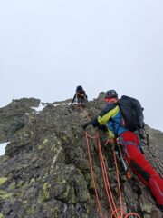 Prima parte, dal colletto Freshfield, bella e non troppo difficile, qualche passo di III° ben ammanigliato e proteggibile. Dalla cima Purtscheller inizia la vera cresta affilata…