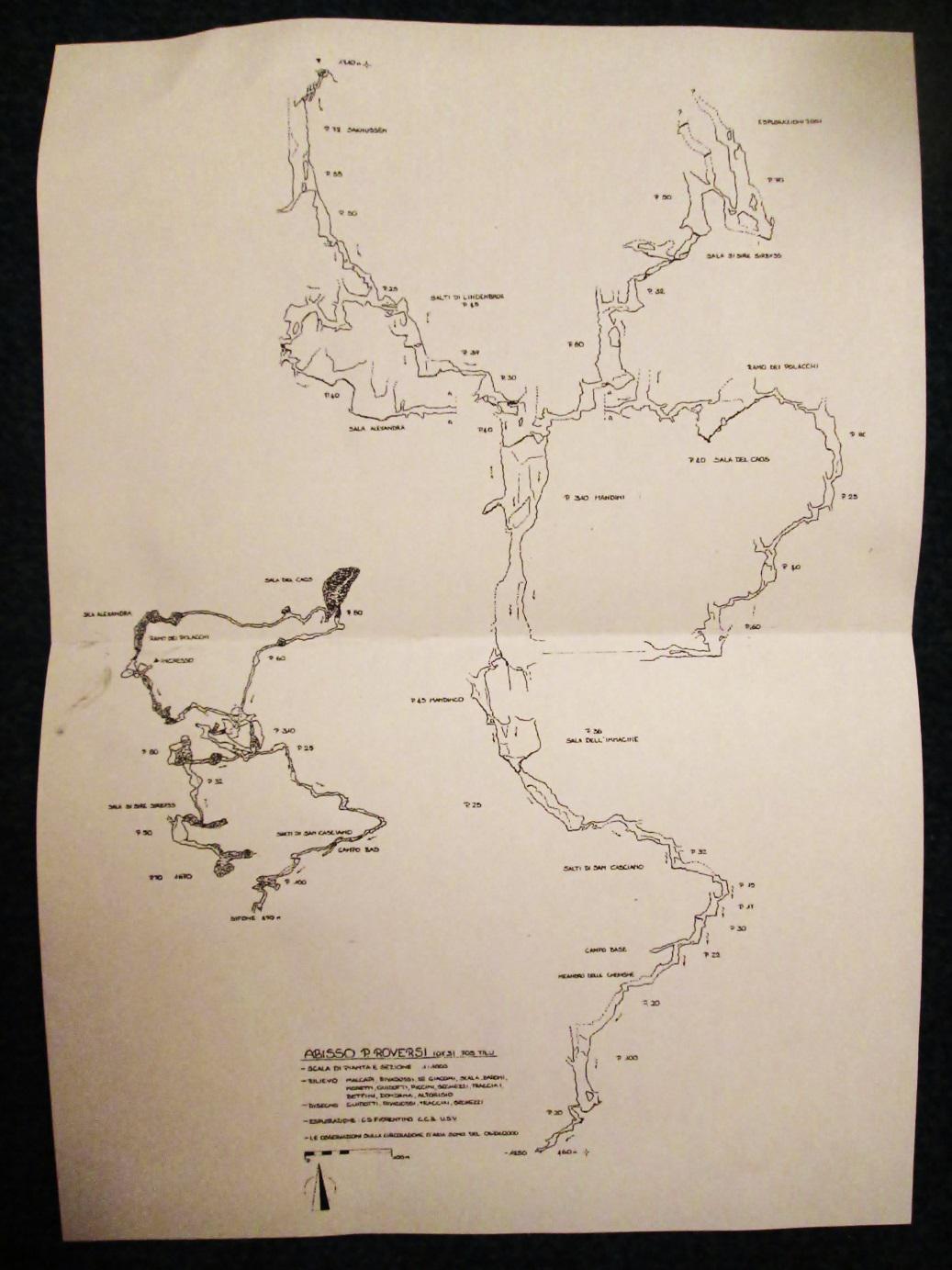 Al primo tratto stretto con saltini arrampicabili, fa seguito il P72 (Saknussem). Seguono un P46,P36, meandro, passaggi disagevoli e vari pozzetti max.17m. Altri due pozzi da 25m. ,P45, P39, P31, P41 che deposita su una sala sospesa.