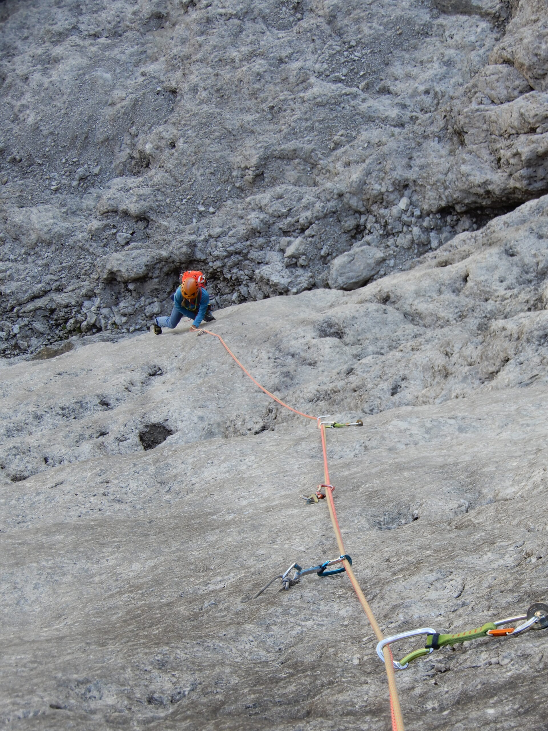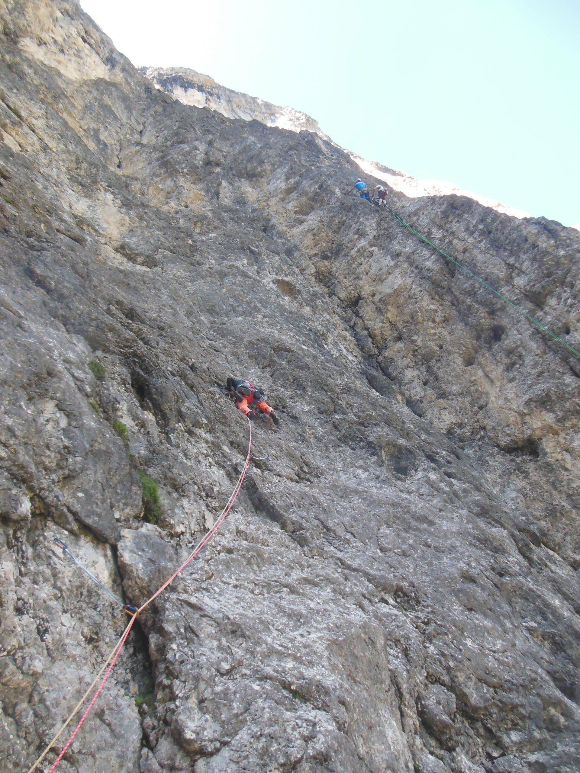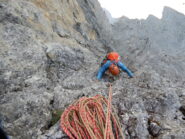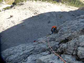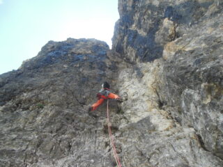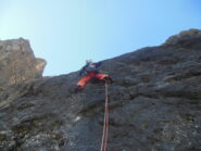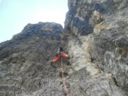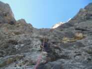 - L2: 5a, 35 m, rampa e placca verso dx alla sosta su cengia