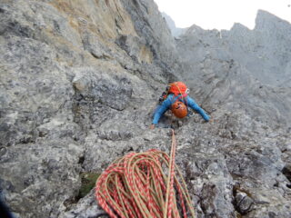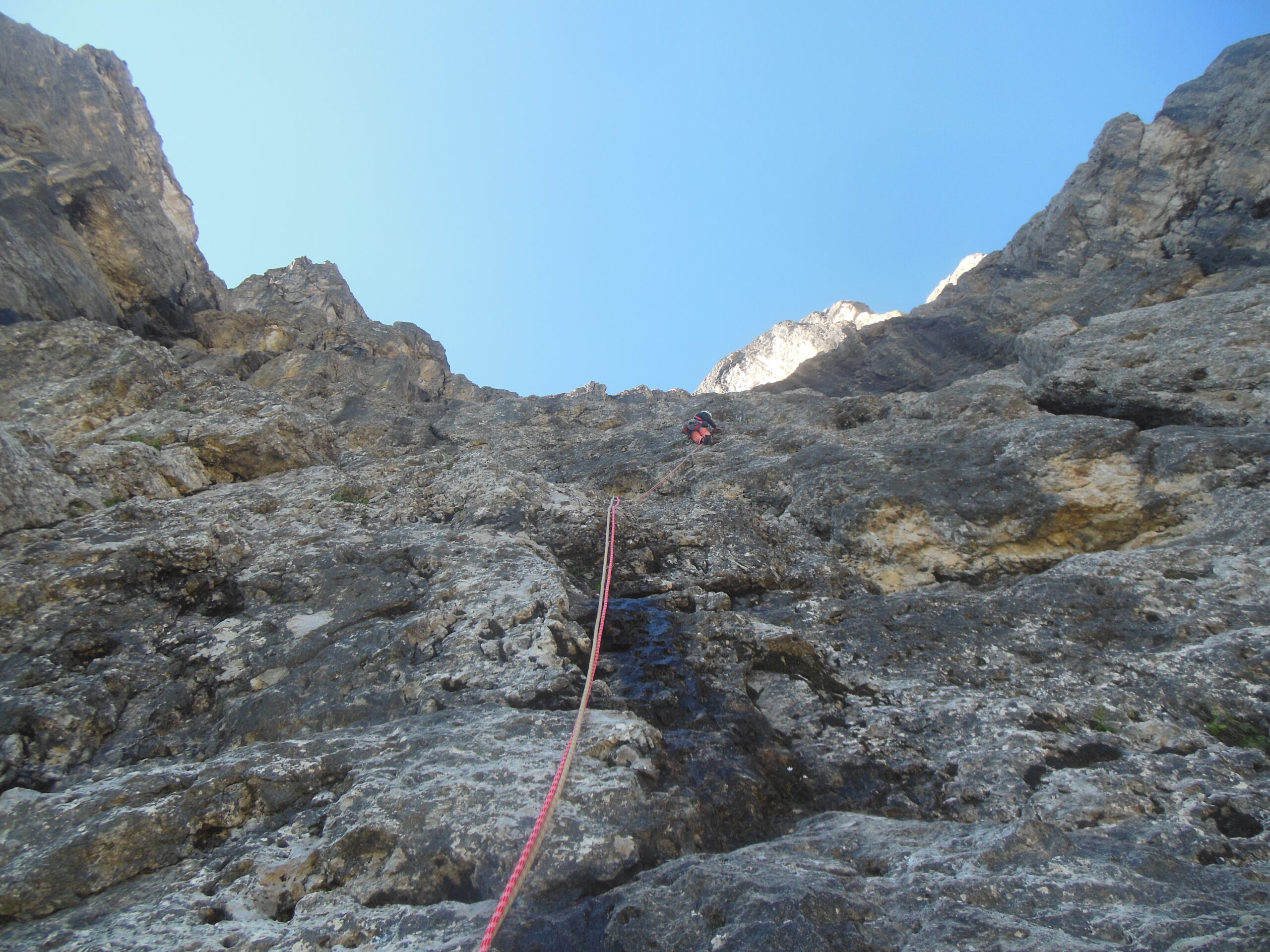 - L12: 5b, 30m, bella lama e poi fessura quasi sempre bagnata (tiro ben protetto), sosta su due fix su di un blocco sul ripiano sommitale