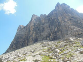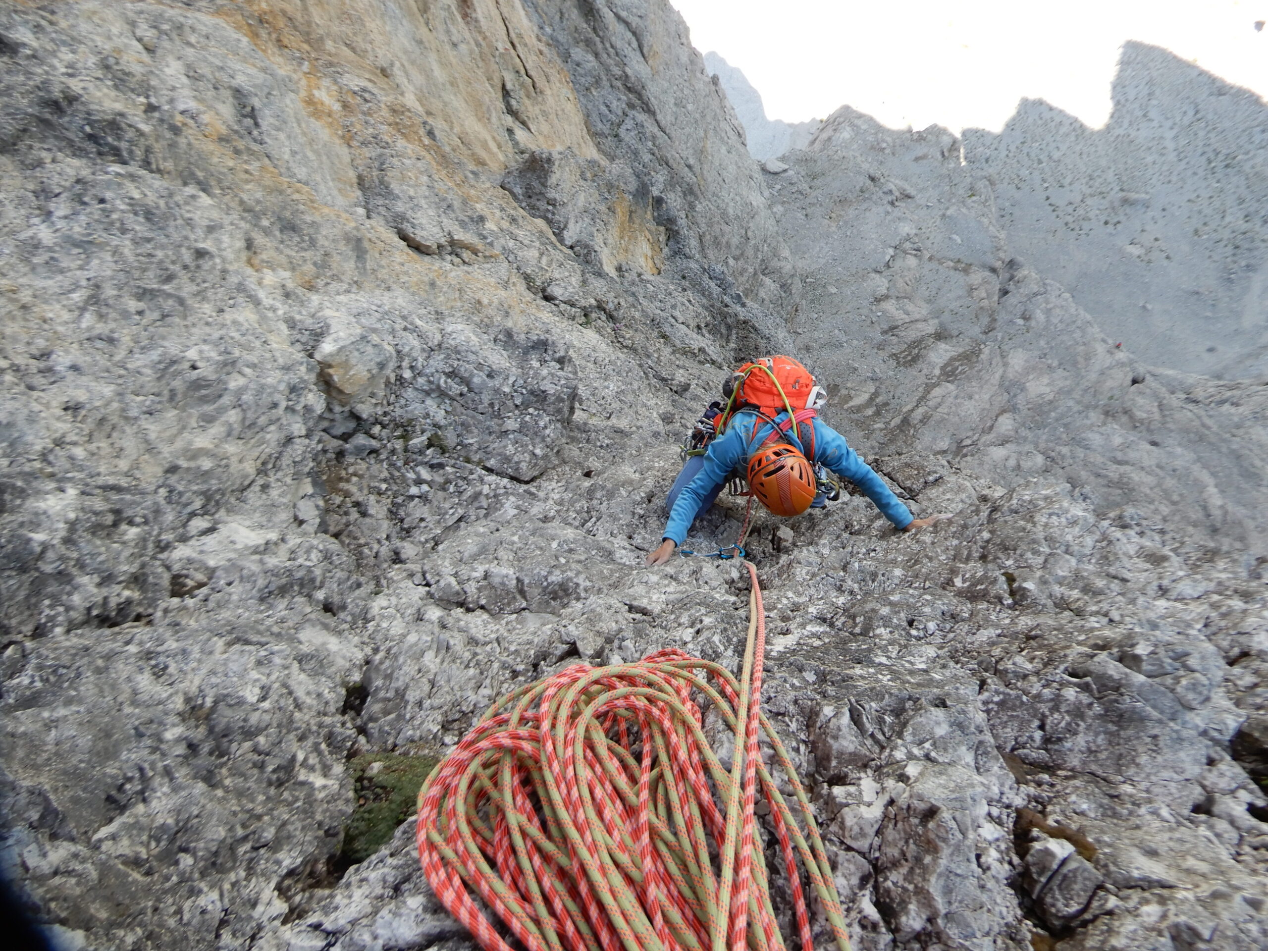 - L5: 5c, 30m, roccia nera lavorata e poi passaggio ostico su svasatura alla sosta, posta al limite della grande cengia (possibilità di continuare in conserva lunga senza fermarsi alla sosta fino alla successiva sosta a terra su di 1 fix con cordone all’inizio della parte verticale della parete, 110m)