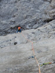 - L7: 6a+, 40m (tiro chiave), placca lavorata con roccia delicata in ascesa verso dx e traverso sempre a dx alla sosta scomoda appesi
