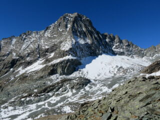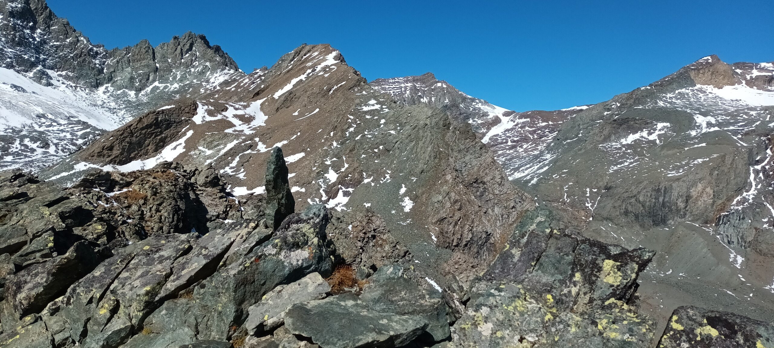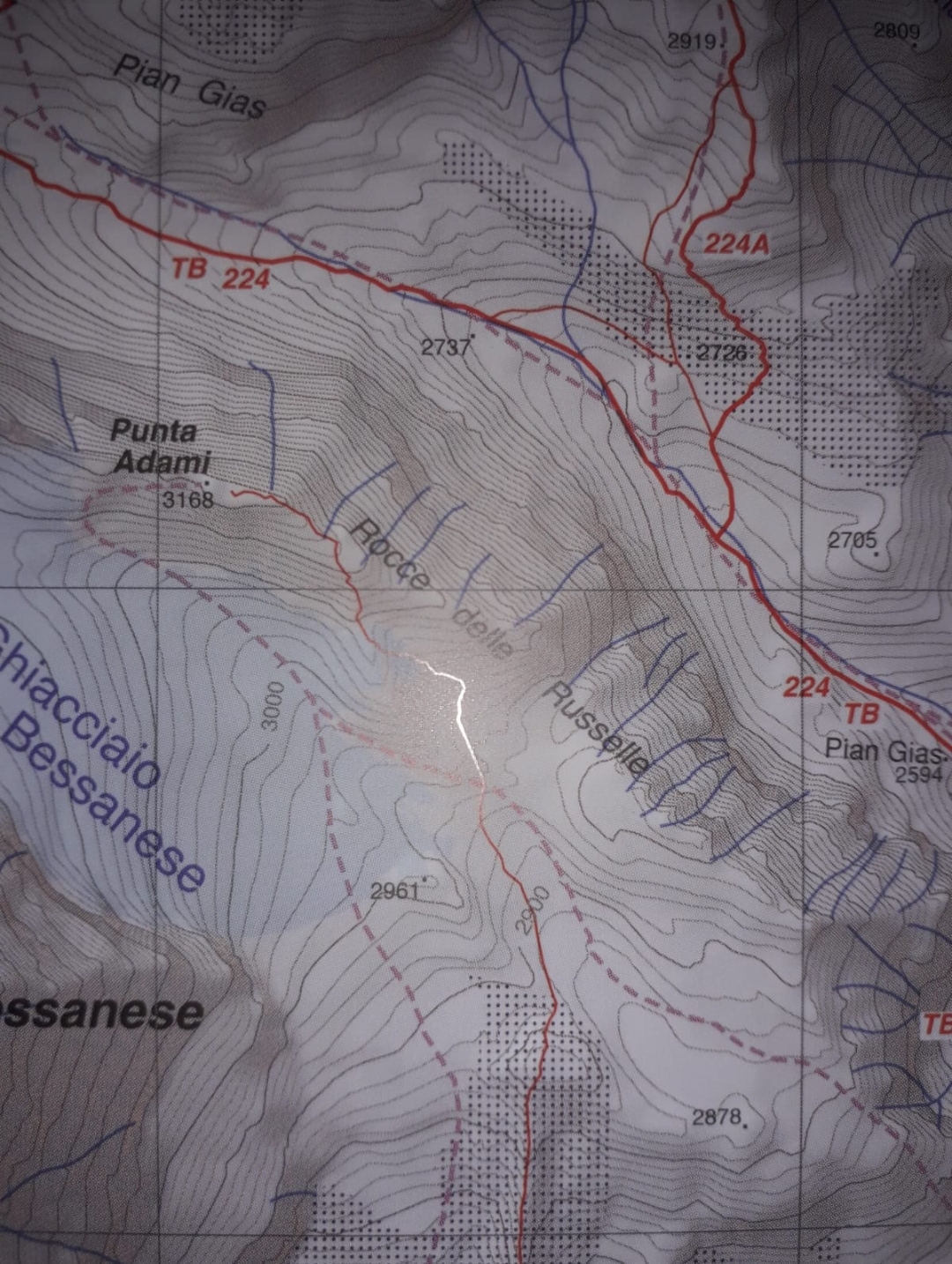 Dal Gastaldi al vicino Colletto delle Vigne; da li risalito il ripido zoccolo basale delle Rocce delle Russelle fino a sbucare su una specie di altopiano a modesta pendenza ( la Adami è di fronte, lontana ).Percorso la pietraie fino alle vicinanze del colletto che precede la Adami stessa e seguito a ritroso la cresta delle Russelle ( a picco su Pian Gias ) fino al rilievo a circa 2970m. Molto panoramico. Percorso a ritroso fino al pianoro sottostante e breve risalita a quota 2910 circa, punto di arrivo della morena laterale del fu ghiacciaio della Bessanese. Discesa del ripido filo al Crot del Ciaussinè e risalita al Gastaldi e al Colletto delle Vigne. Scesi poi dal sentiero 223, fino al Gias della Naressa ad intercettare il classico 222 sopra Pian dei Morti. Dislivello complessivo è almeno 1250m. Ringrazio l’amico Pier Luigi che mi ha accompagnato e guidato in questa escursione.