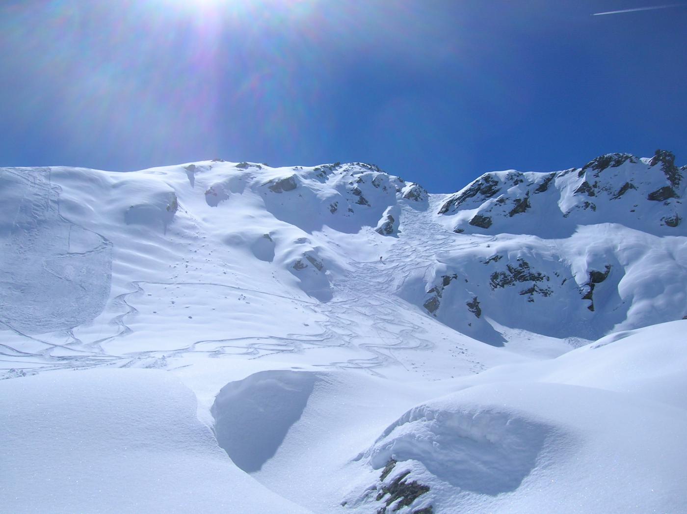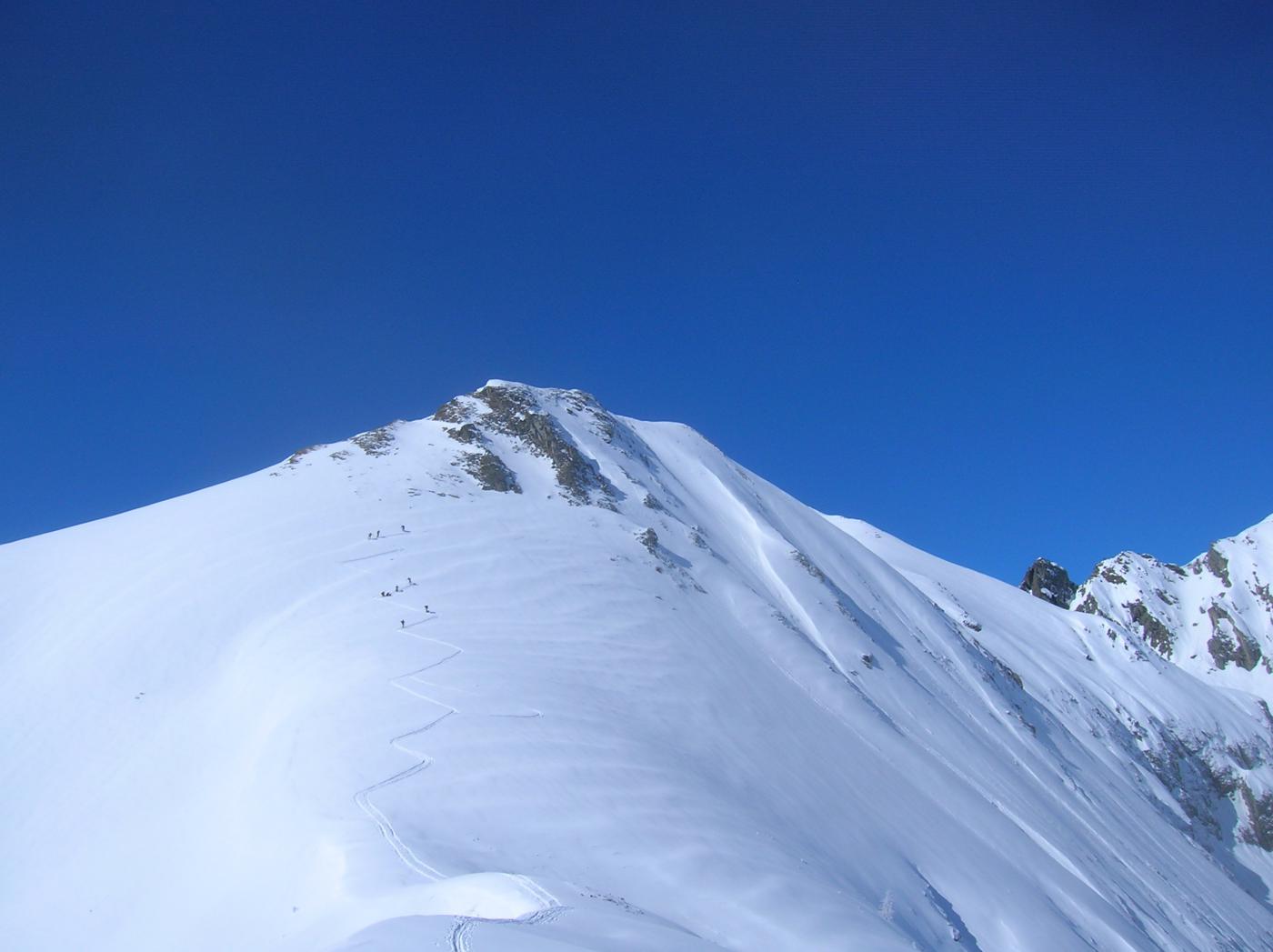 Pian Benot – Pala Rusà – discesa nella conca sottostante (per circa 320 m di dislivello) – risalita al colle della Portia – pendio e poi cresta verso dx e di nuovo pendio fino in vetta all’Adois (circa 575 m dalla Portia). Discesa dal pendio canale Nord fino di nuovo alla conca – risaliti alla punta delle Lance (altri 250 m) e quindi discesa per la cresta in direzione Benot e poi per ampii e bei pendii.