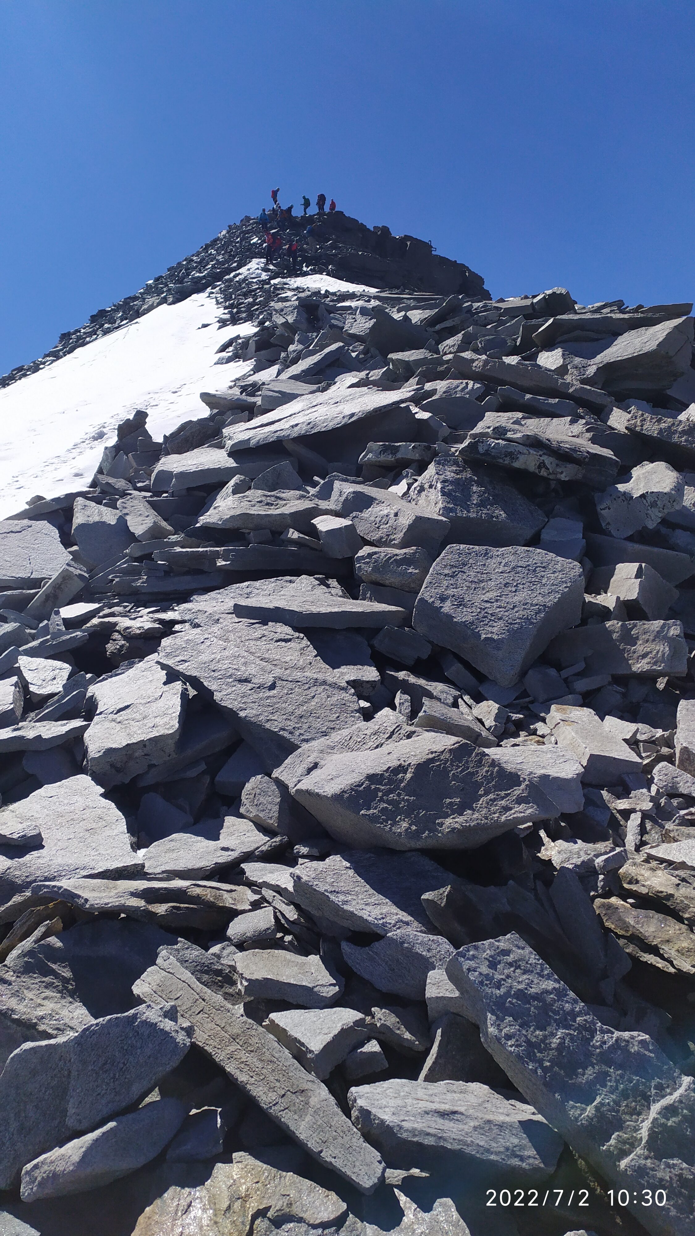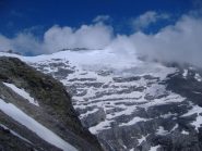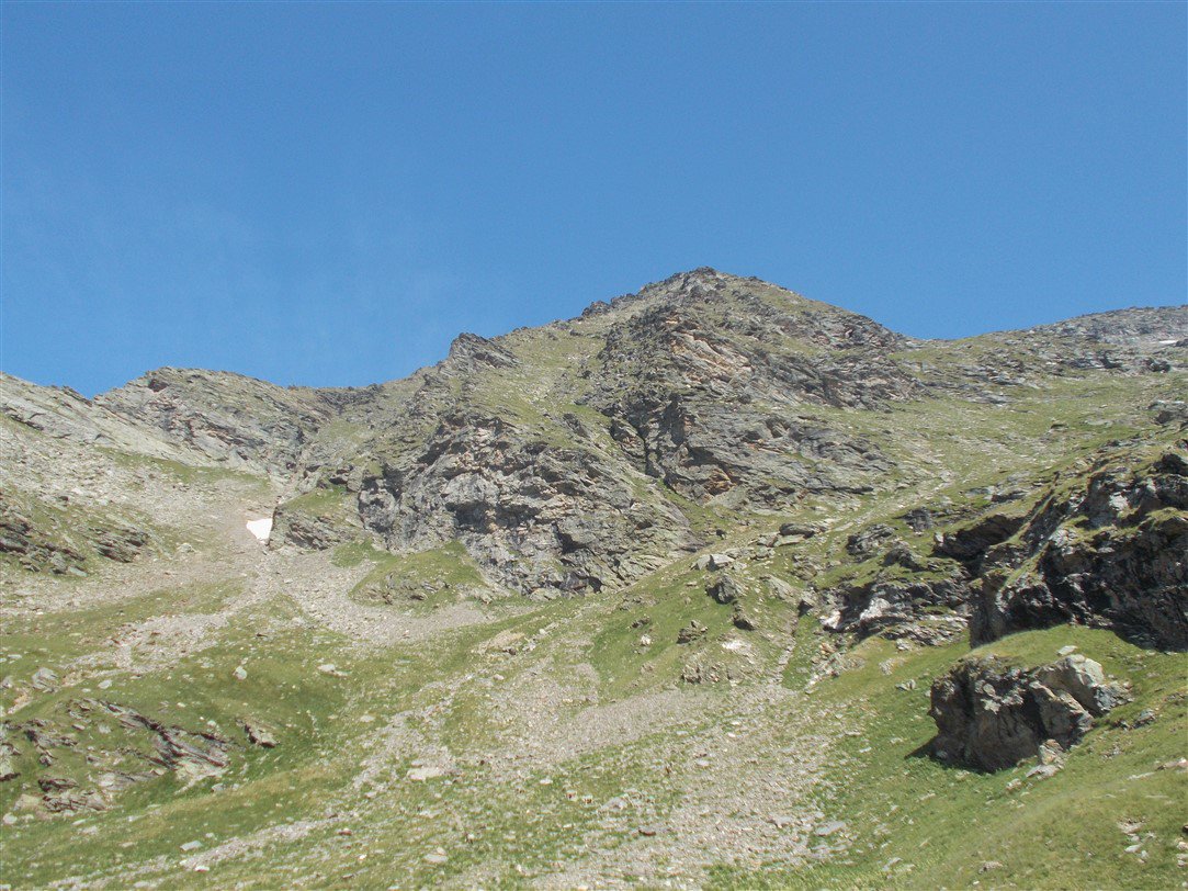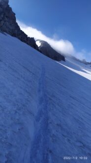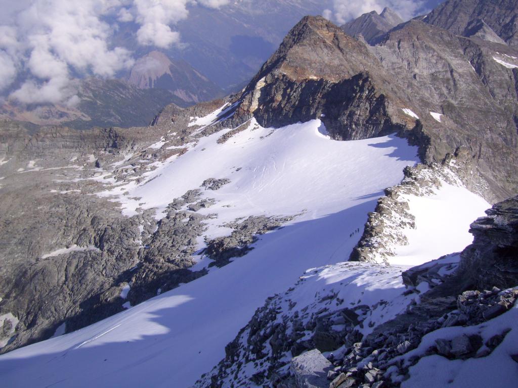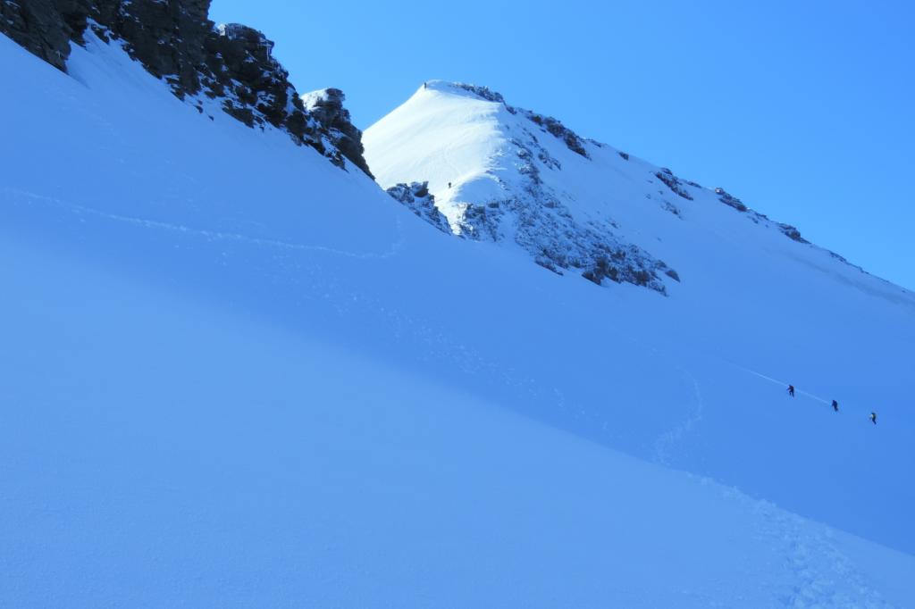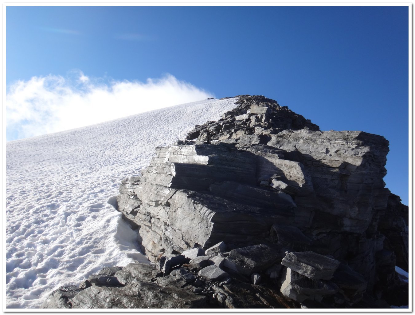 Qui con un breve tratto più ripido (possibilità di trovare una crepaccia terminale) si sbuca sul colletto, e si mette piede sul versante opposto della montagna, costituito da un pianoro glaciale. Si piega ora verso destra, o seguendo fedelmente la cresta con un primo breve tratto di roccette, oppure più comodamente ci si abbassa di qualche metro sul versante sud, per poi riprendere a salire il pendio-crestone nevoso (senza percorso obbligato) fino a che questo si restringe ormai in vista della cima. Un brevissimo tratto di cresta nevosa e di lastroni rocciosi porta alla bella croce metallica posta in vetta.