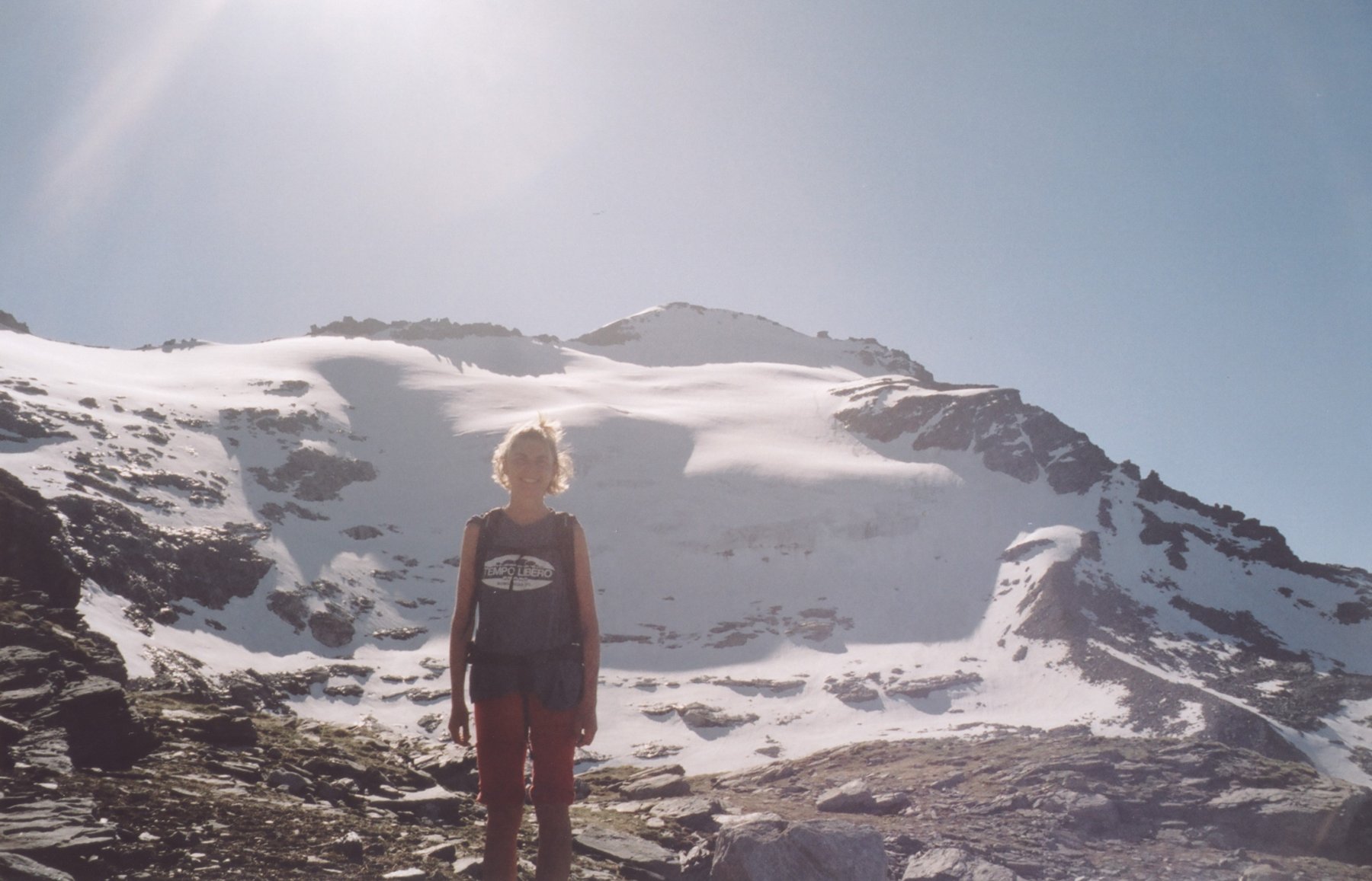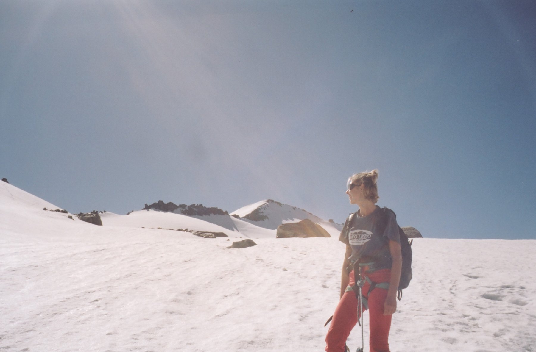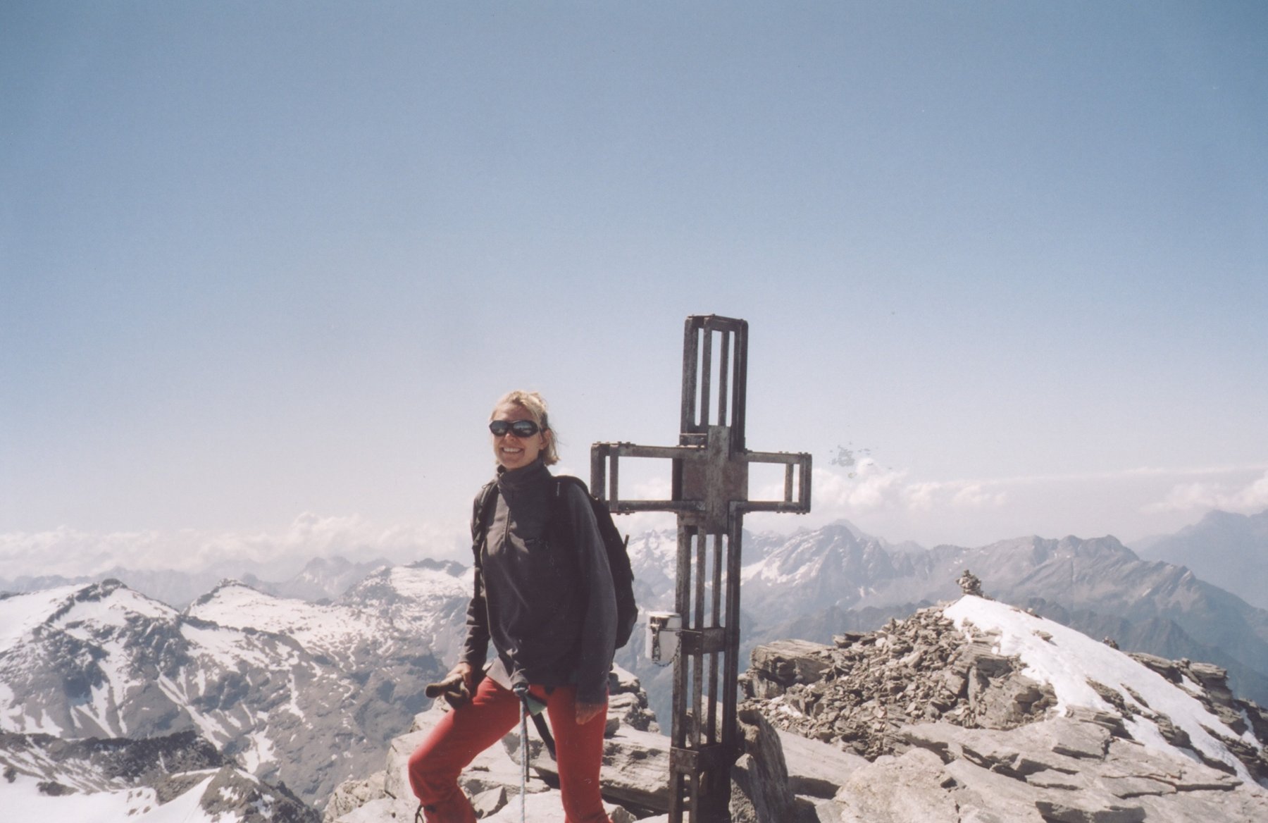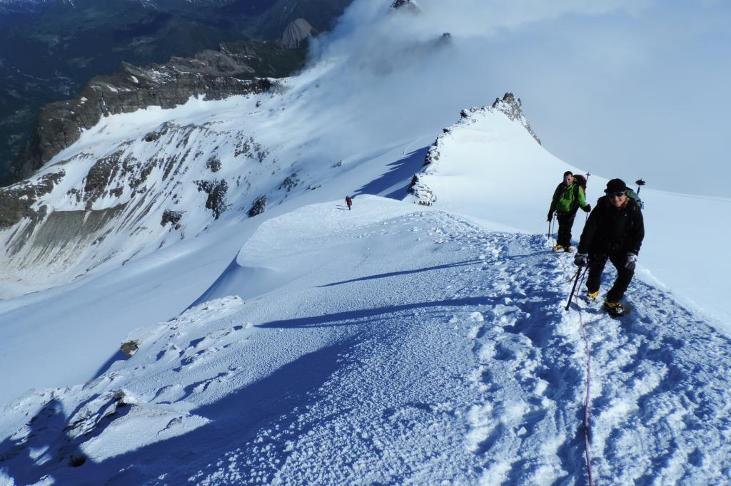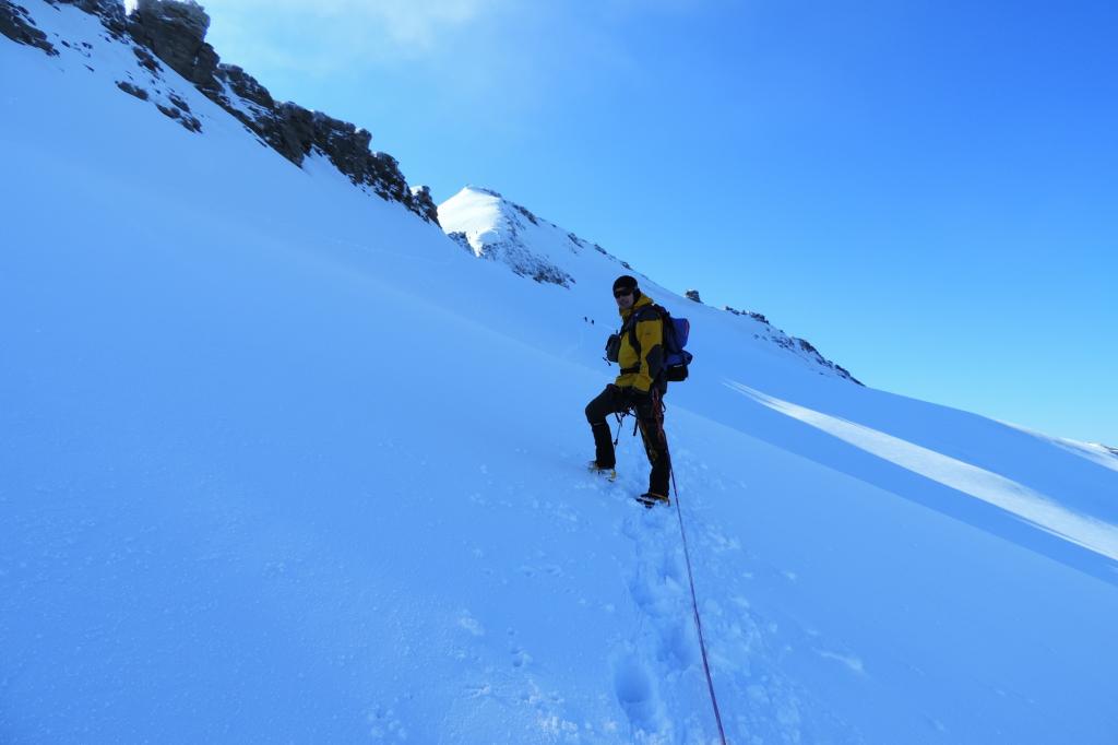 Qui con un breve tratto più ripido (possibilità di trovare una crepaccia terminale) si sbuca sul colletto, e si mette piede sul versante opposto della montagna, costituito da un pianoro glaciale. Si piega ora verso destra, o seguendo fedelmente la cresta con un primo breve tratto di roccette, oppure più comodamente ci si abbassa di qualche metro sul versante sud, per poi riprendere a salire il pendio-crestone nevoso (senza percorso obbligato) fino a che questo si restringe ormai in vista della cima. Un brevissimo tratto di cresta nevosa e di lastroni rocciosi porta alla bella croce metallica posta in vetta.