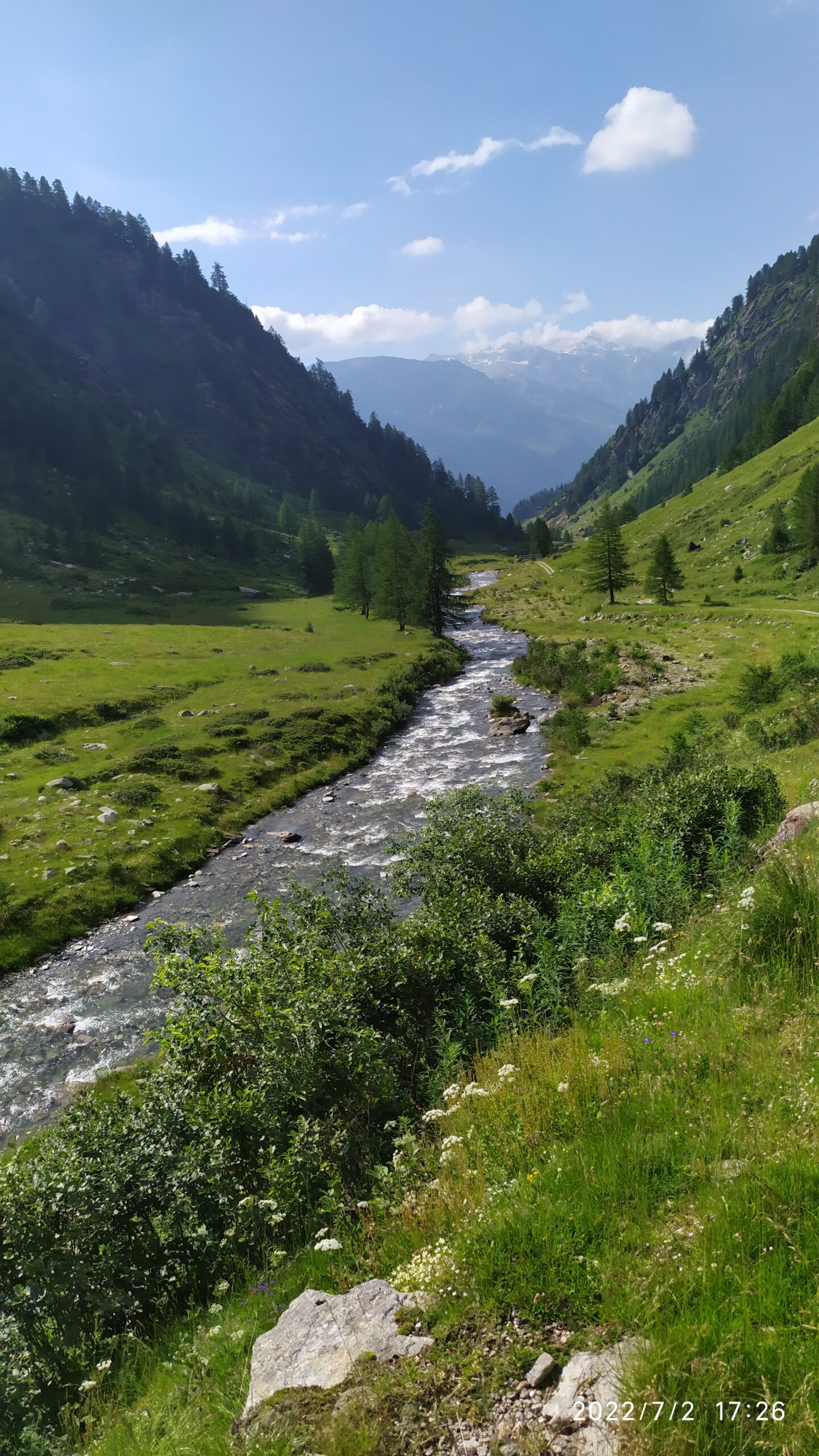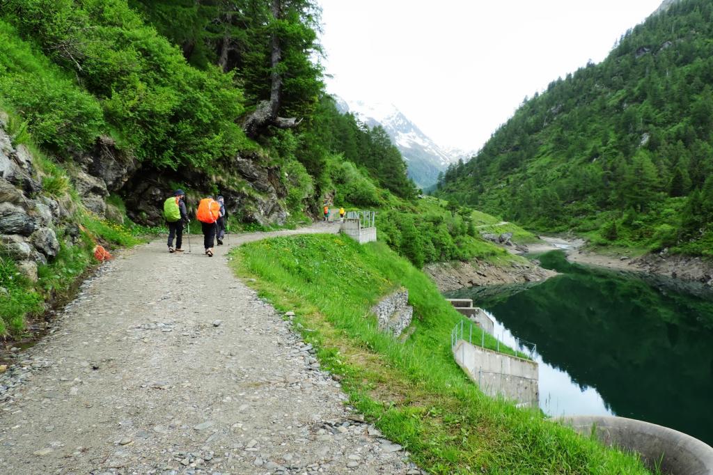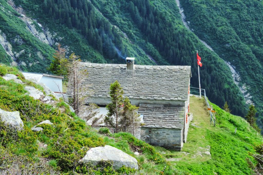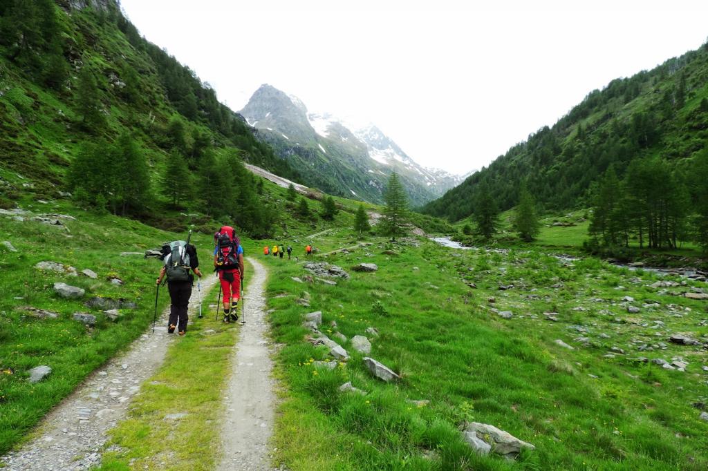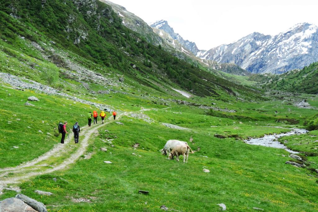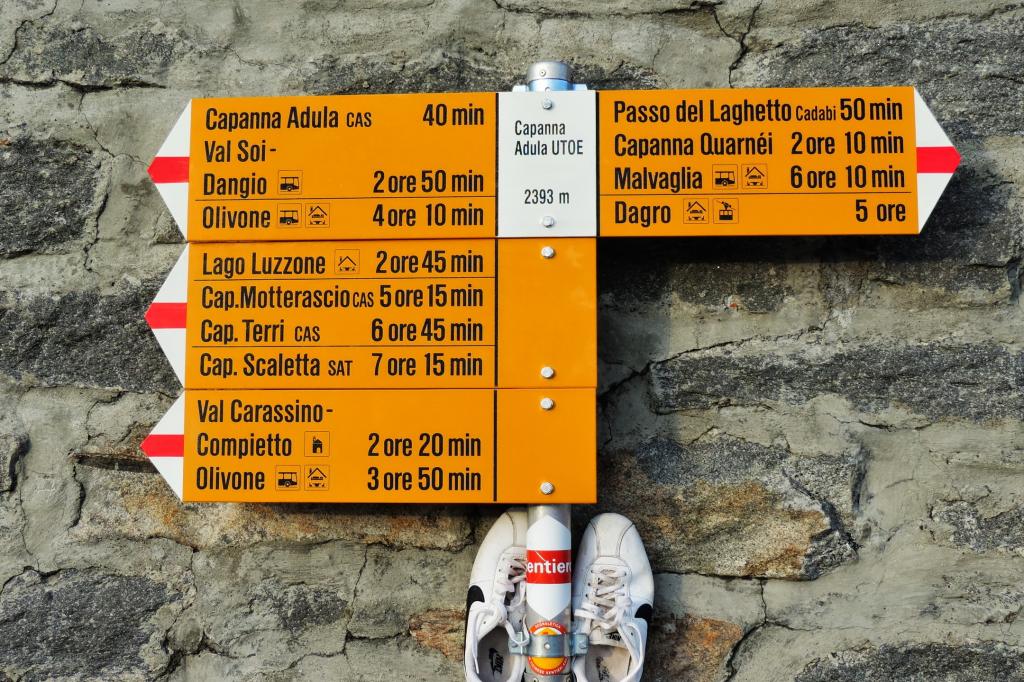 Dal Passo Muazz proseguire sulla strada sterrata che poco dopo raggiunge dall’alto la Diga di Compietto ed entra nella lunga Val Carassino. Si toccano alcune baite e si segue sempre fedelmente la sterrata in lievissima pendenza, tra pascoli, ruscelli, cascate e rododendri.Si tralascia a destra una stradina che termina ad una baita, e si prosegue fino in fondo alla valle, dove con un paio di tornanti la strada sale fino alla Capanna Adula CAS 2012 m (gran punto panoramico sulla vallata sottostante e sulle cime del circondario. Seguendo il sentiero ora verso sinistra, ci si porta sotto il costone che sorregge la Capanna Adula UTOE, già visibile in alto. Il sentiero ora sale molto ripido sul costone erboso, e superato il tratto più faticoso si sposta verso destra attraversando il torrente, e con un traverso a mezza costa giunge alla Capanna Adula UTOE 2393 m.