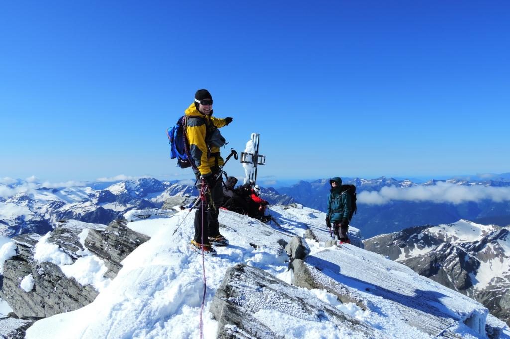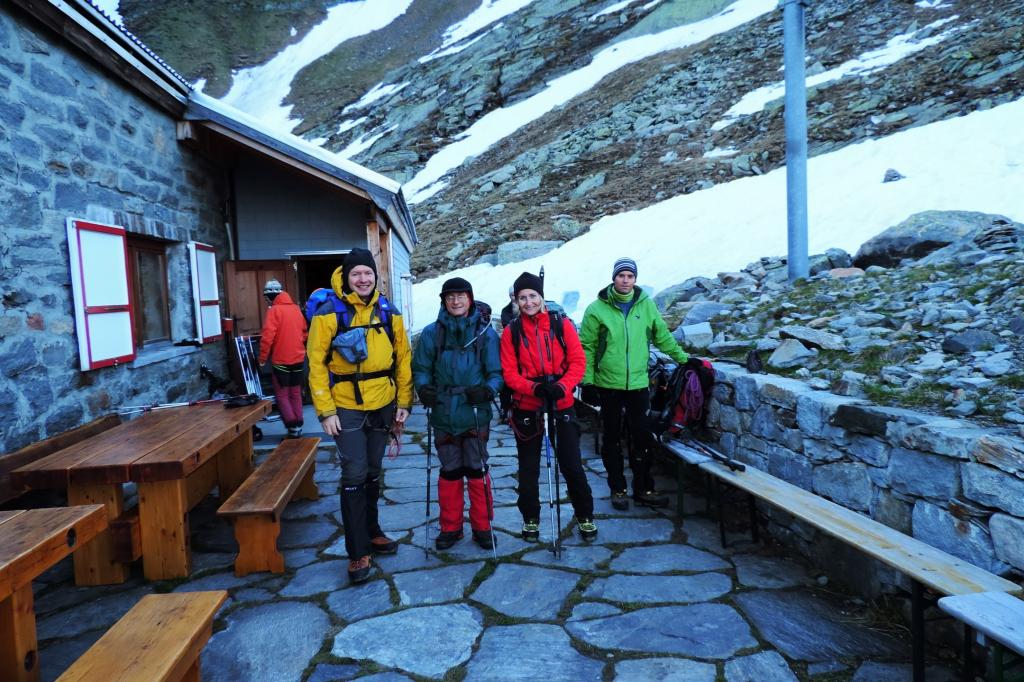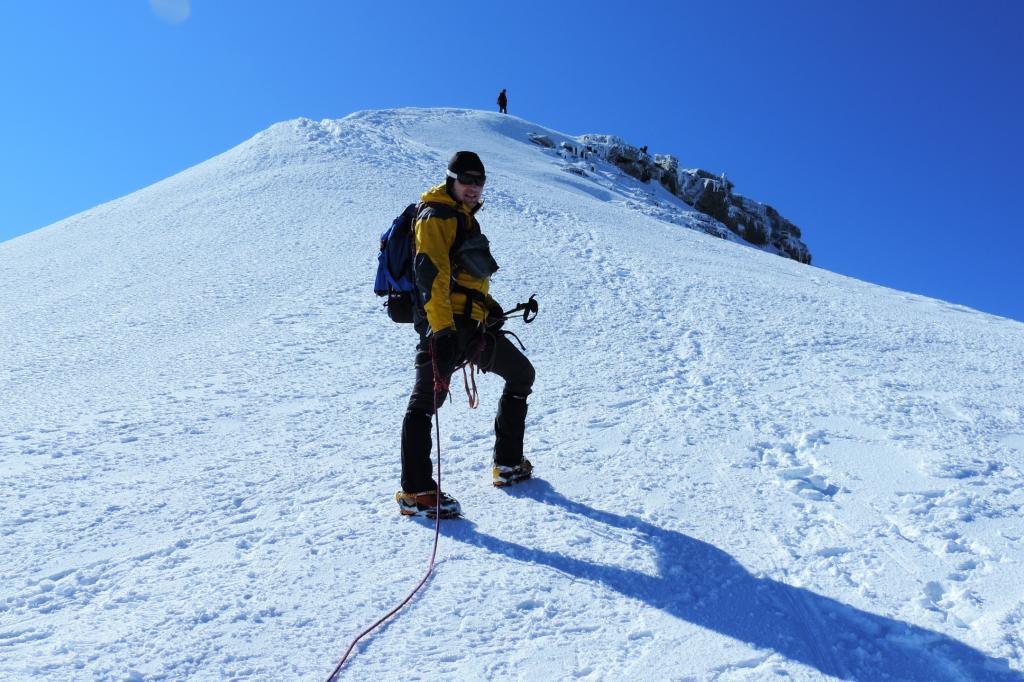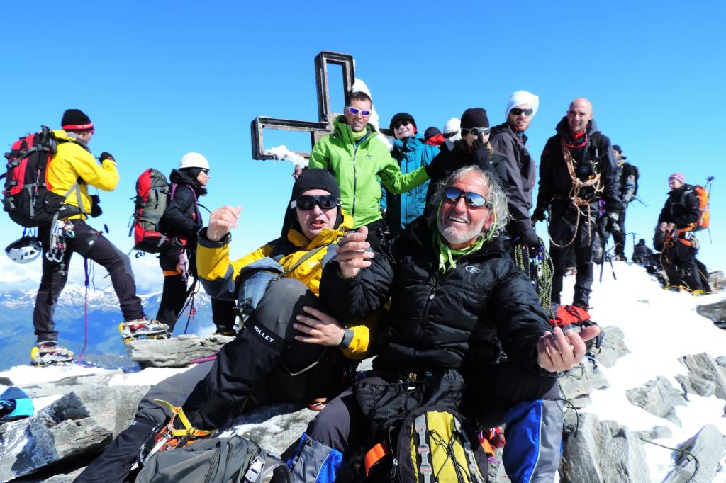 La Valle Carassino si risale in piano lungo una stradina, ed è piuttosto lunga (ben 7 km..!) fino alle vicinanze della Capanna Adula CAS, poi il sentiero sale ripidamente per pendii erbosi e pietrame fino alla Capanna Adula UTOE, meta di giornata. Sentiero sempre agevole e ottimamente segnalato, saliti in ore 2,30. Buono il trattamento e l’accoglienza al rifugio, per fortuna non al completo. Il giorno seguente, partenza alle 5,45 con cielo sereno a parte il “cappello” di nuvole che fascia la cima e il vento che da sempre ci fa compagnia..! Prima parte di salita tra lingue di neve e sentierino con ometti lungo il costone che porta verso il Ghiacciaio di Bresciana, in compagnia di altre 30 persone partite dallo stesso rifugio. Troviamo la neve in copertura continua dai 2650 m., neve compatta e dura che regge bene la nostra camminata. Dopo aver percorso un primo tratto del Vadrecc di Bresciana, a circa 2800 m. decidiamo di procedere legati in cordata più per scrupolo che per reale necessità dato che i crepacci sono ancora abbondantemente coperti e chiusi. Grazie al buon rigelo notturno e alla temperatura bassa la neve è in ottime condizioni e si sale decisamente bene. Dopo un lungo tratto di salita a mezzacosta e passati sotto l’Adulajoch proseguiamo verso un secondo colletto della cresta Nord-Ovest, raggiunto dopo una ripida rampa nevosa…sempre in compagnia del vento…che però ha ripulito il cielo dalle nuvole ed ora è tutto sereno con visibilità ottima. Risalita la prima ripida rampa della cresta, poi lungo il filo più aereo arriviamo in cima, dove oltre alla croce, troviamo anche un’altra ventina di alpinisti, più i nostri compagni di gita. In vetta cessa il vento, la visibilità è ottimale, il panorama vastissimo e semplicemente spettacolare (dal Gruppo del Rosa, all’Oberland Bernese, Lepontine, fino ai lontani Gruppi del Disgrazia e Bernina). Dopo oltre 1 ora di permanenza in vetta (e oggi ne valeva assolutamente la pena!) ci siamo avviati in discesa, la neve ha tenuto bene e non ha creato alcun problema. Una sosta per riposarci al rifugio e poi giù per la discesa dalla Capanna Adula UTOE fino al parcheggio, che a dire il vero, è stata lunghetta e da…bollitura dei piedi ! Ottima scelta quella di salire l’Adula, montagna che merita decisamente di essere presa in considerazione e salita ! Pienamente ripagati della scelta fatta…valutazione da 5 stelle senza alcun dubbio!