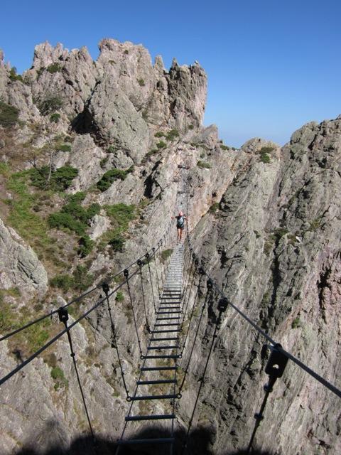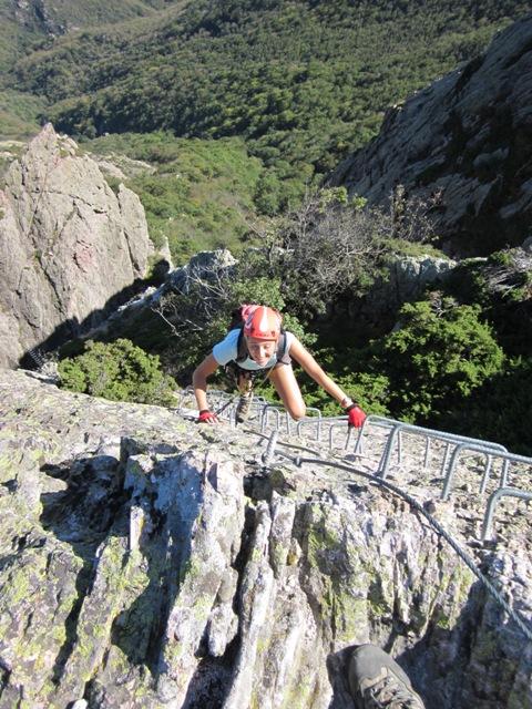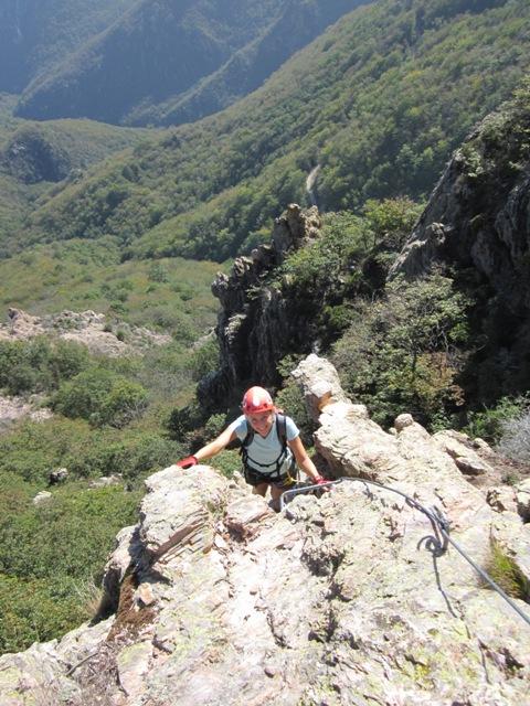 La ferrata è lunga ma abbastanza discontinua e non particolarmente impegnativa. Si alternano tratti più impegnativi e verticali (cmq sempre abbondantemente attrezzati) ad altri in cui si tratta più di un sentiero attrezzato che di una ferrata. Alcuni torrioni sono davvero estetici e tutta la ferrata è molto panoramica, svolgendosi in gran parte lungo una cresta. La roccia è un calcare solidissimo e molto gradinato e manigliato, quindi si può salire senza praticamente attaccarsi al cavo. Molto bello e adrenalinico il ponte tibetano (peraltro aggirabile!!!), che è un po’ ballerino specie nel primo tratto in leggera discesa. Concordo con chi dice che forse è un po’ eccessiva la quantità di cavi e gradini metallici, che riducono notevolmente la difficoltà, però è anche vero che così facendo diventa un percorso adatto anche a chi è alle prime armi e quindi va bene così!!!