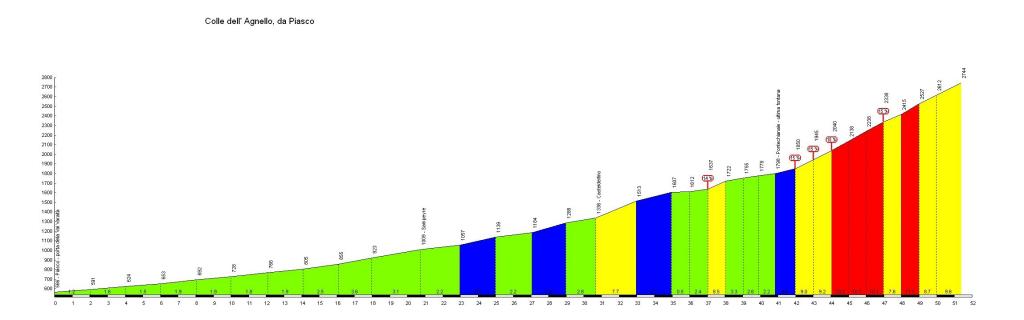Da Piasco (o da un altro punto di partenza più avanti nella Val Varaita se si vuole diminuire il dislivello) si risale la val Varaita in leggera ma costante salita fino a Casteldelfino; di qui in 21 km si affrontano i quasi 1500 m di dislivello per arrivare in cima al colle dell’Agnello.