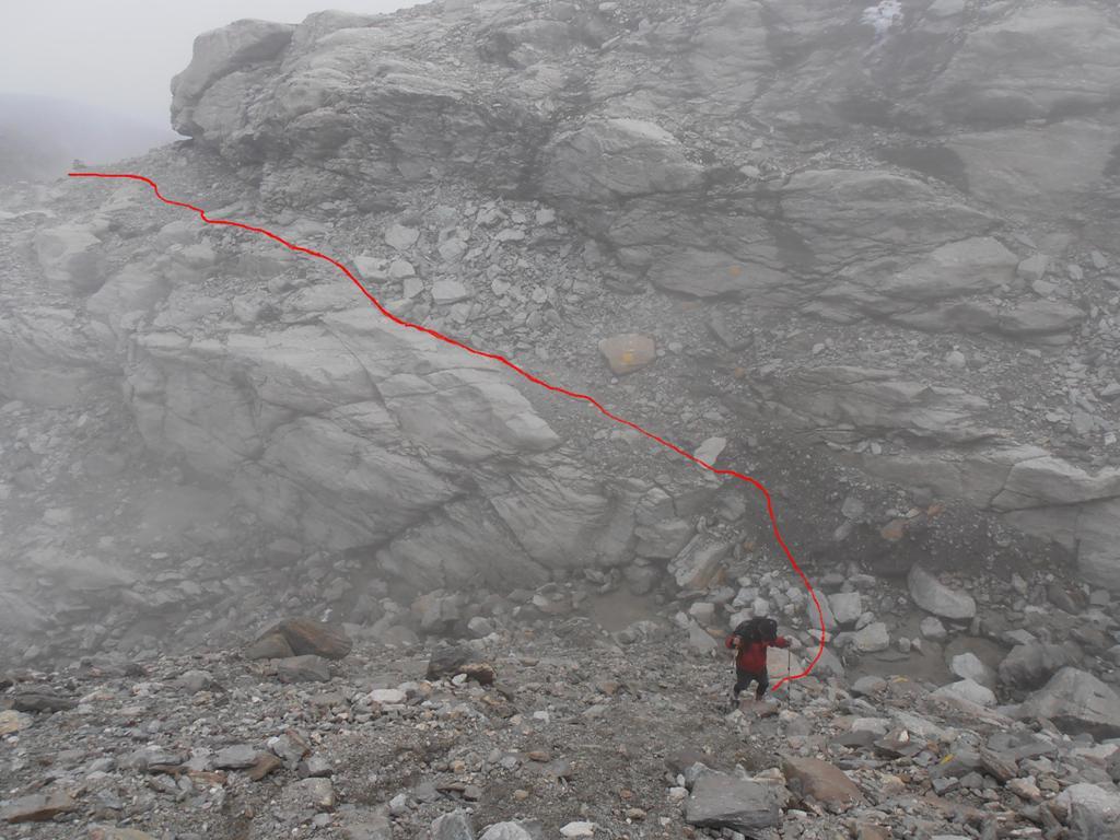 La traccia, ben indicata da ometti , sale dapprima sulla sinistra orografica per poi spostarsi sullla destra orografica per evitare il canale che scende dal colle, innevato fino a tarda stagione.