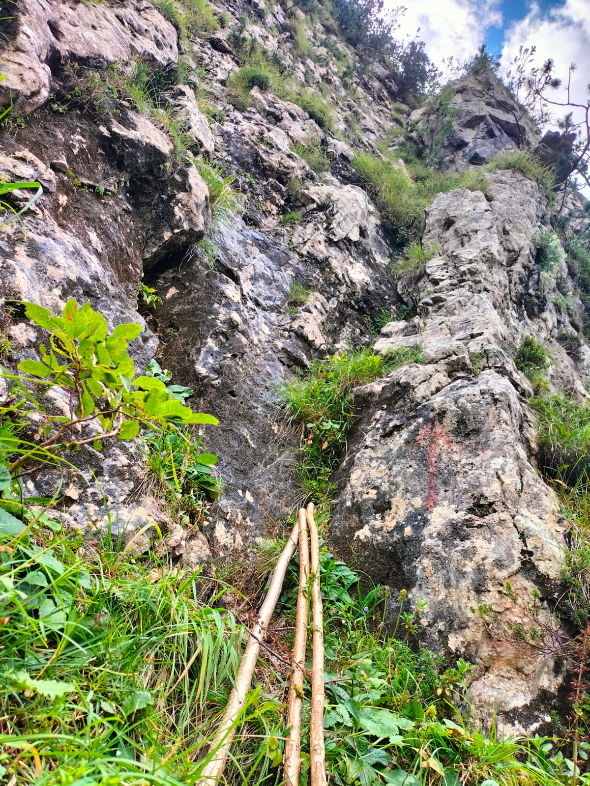 Le difficoltà sono terminate e per raggiungere la terrazza detritica sotto la vetta occorre salire circa 150 Mt. di facili ma esposte roccette di II e III. Il percorso non è obbligato, comunque si punta ad oltrepassare il canale dove risulta più comodo e proseguire poi sulle rocce più semplici a sinistra dello stesso. Obliquando poi verso destra si raggiunge la base della terrazza. Continuando verso destra (sempre viso a monte) si raggiunge il bordo della terrazza dove si trovano le indicazioni per il bivacco Biasin (circa 15 minuti) o per la vetta. In entrambe le direzioni dei cavi di ferro facilitano alcuni passaggi. Noi siamo scesi al bivacco dove abbiamo pernottato.