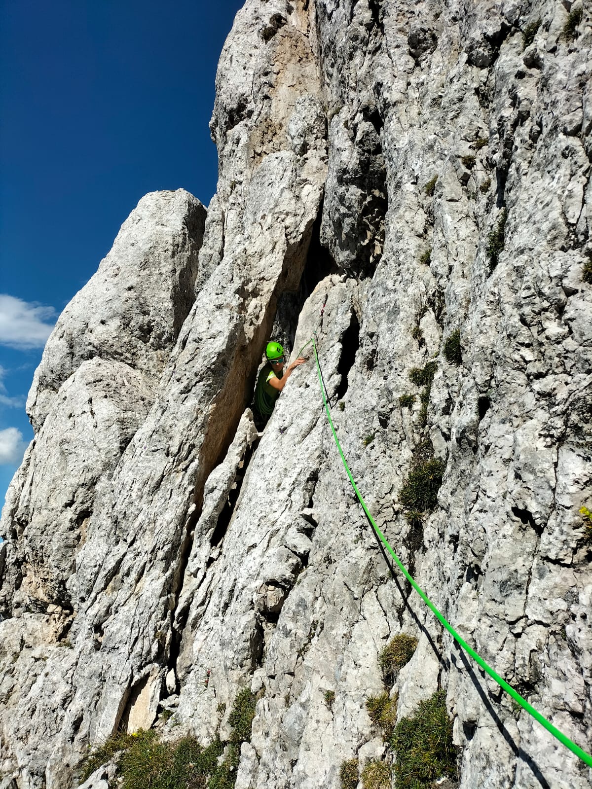 tiro chiave della via. Si è di fronte ad una placca molto compatta sulla quale si notano dei chiodi e cordini per azzeramento… E’ una variante che è meglio non percorrere (come abbiamo invece fatto noi). Dalla sosta ci si sposta a destra aggirando uno spigolino. Qui c’è una fessura-diedro verticale ben chiodata (alcuni chiodi insicuri ed 1 cuneo). Salirla sino a raggiungere la sosta.