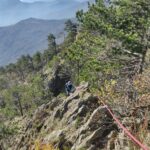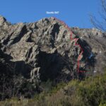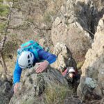 Ritornando a salire verso sx, si vince dunque un’ultima paretina che si erge a difesa del punto più alto della rocca, costituito da una affilata e panoramica cresta, con affaccio sulle sottostanti cascate del Rio Cu du mundu (IV; 3 ch.; sosta su cless. attrezzata sull’ultimo spuntone con fettuccia e maillon di calata).