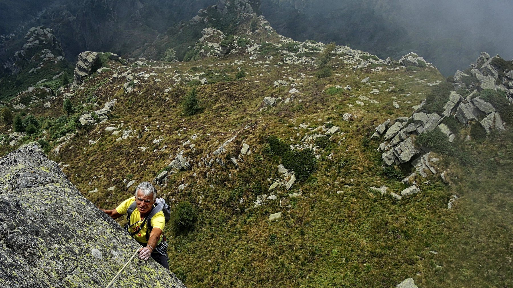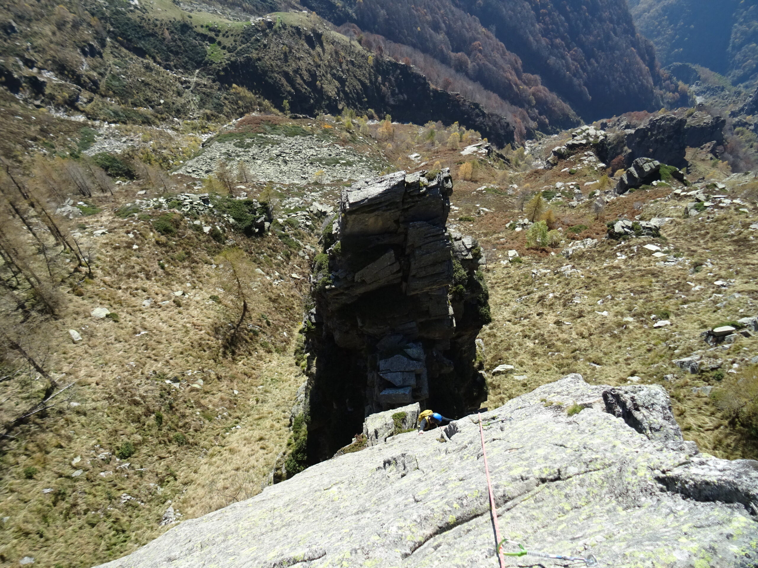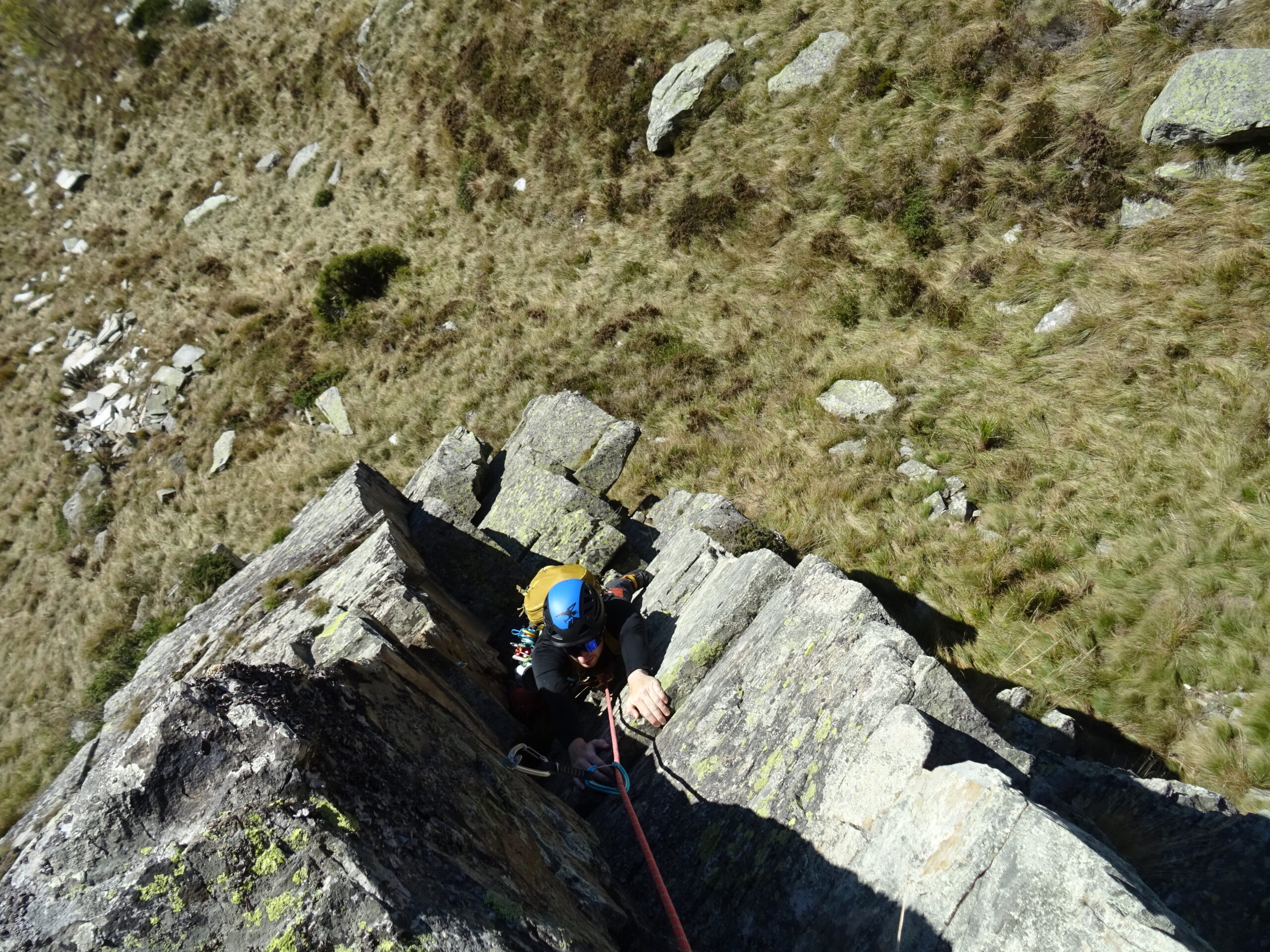 •L7. Superare un piccolo spuntone (3c), da cui si scende facilmente all’intaglio successivo. La sosta si trova su una cengia a sx del filo di cresta. In tutto, 15m facili.
