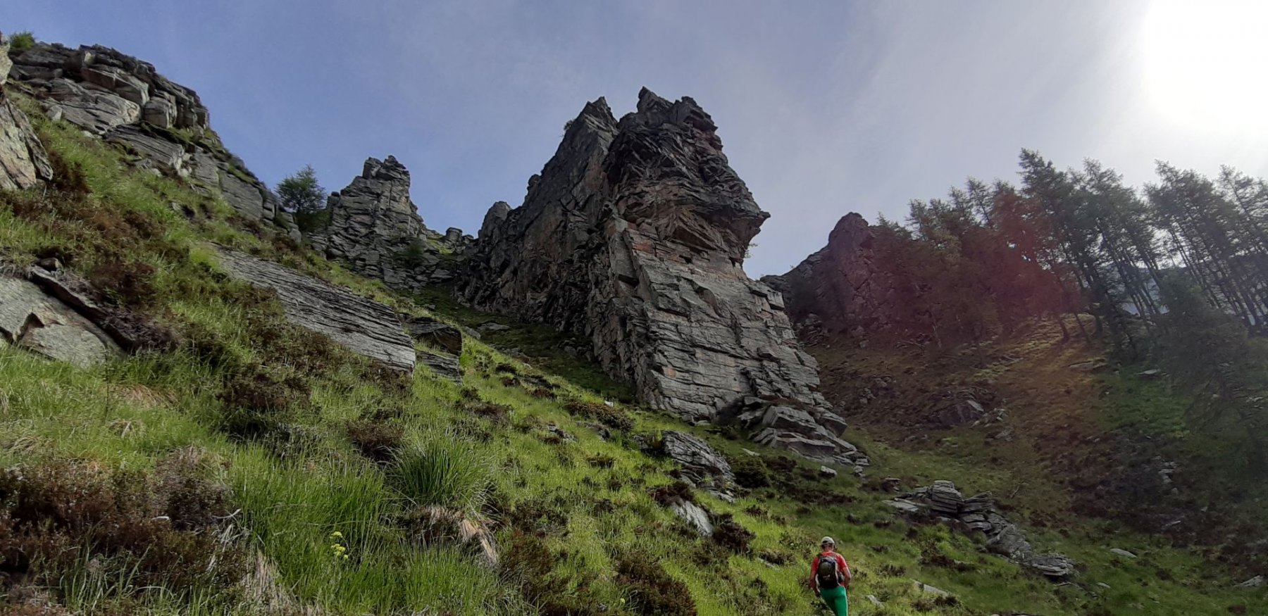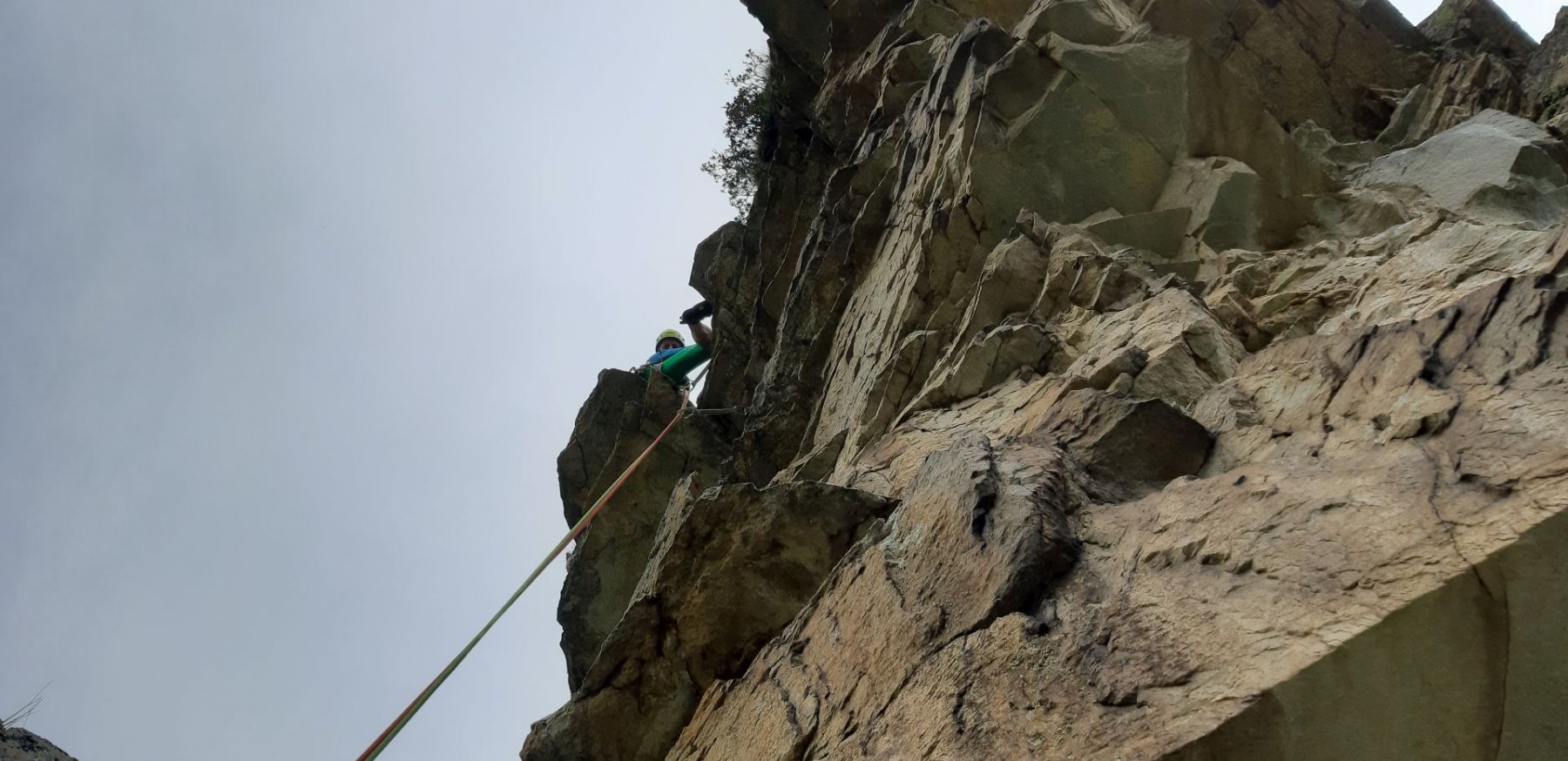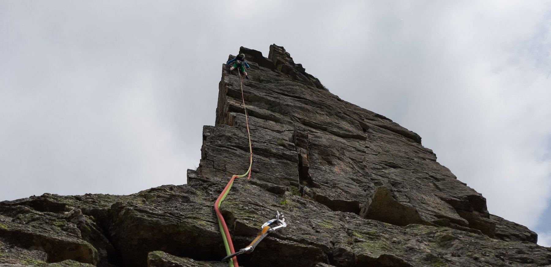 •L7. Superare un piccolo spuntone (3c), da cui si scende facilmente all’intaglio successivo. La sosta si trova su una cengia a sx del filo di cresta. In tutto, 15m facili.