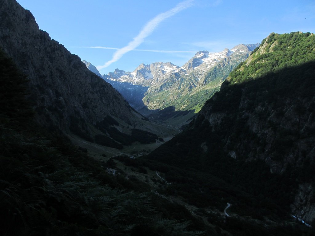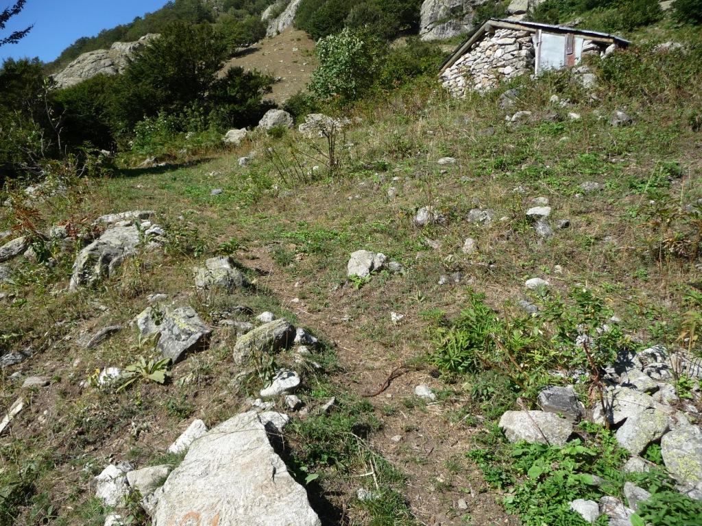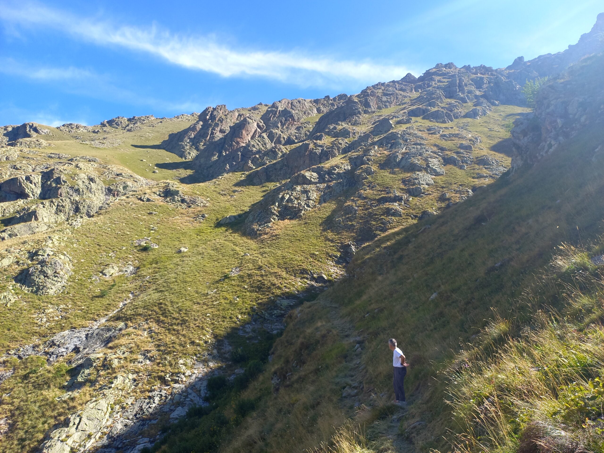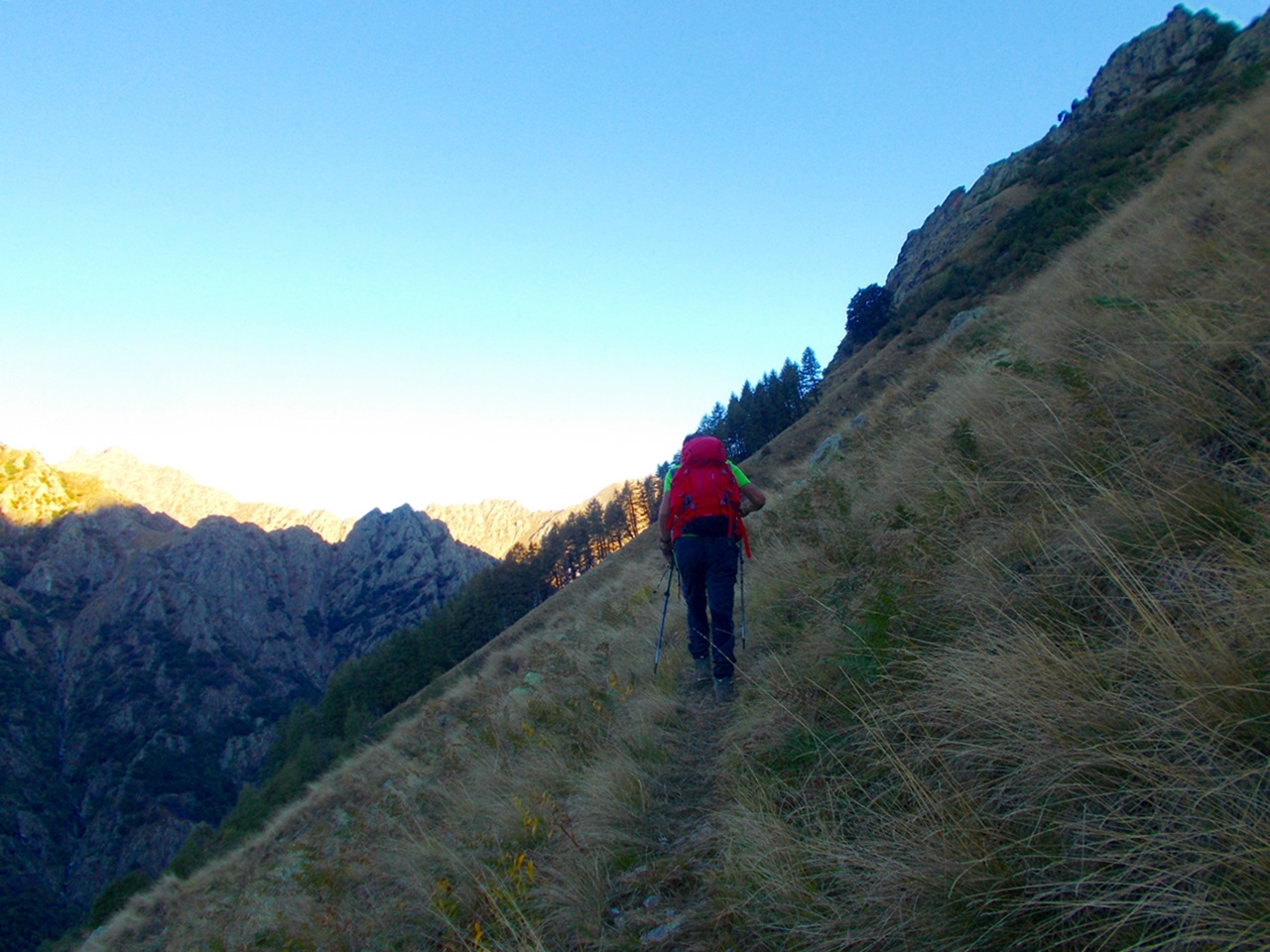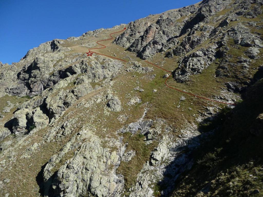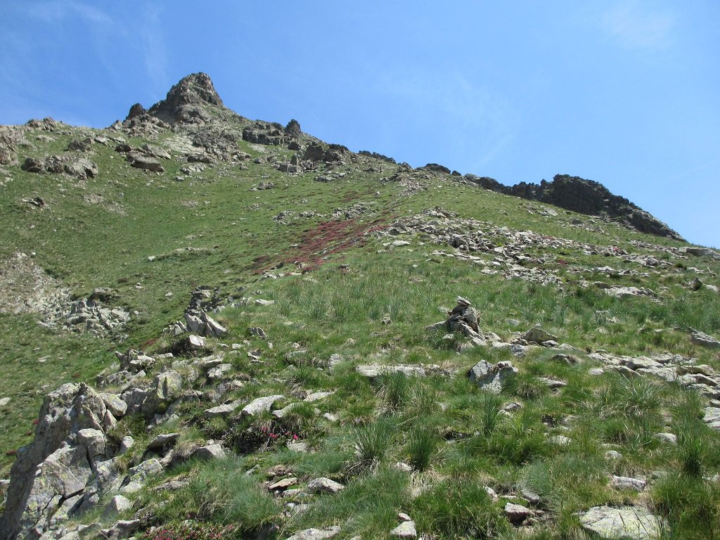 Un buon sentiero ora inizia a salire nel bosco con una lunga serie di tagli sul pendio, poi si esce dal bosco e si prosegue per assolati pendii erbosi. Fino a 1700 m di quota (ci sono dei ruderi di antichi gias) la mulattiera è ampia e ben delineata e la salita in pendenza costante non è mai faticosa. Da lì in poi il sentiero diventa meno marcato ma sempre ben evidente (sono stati anche messi dei paletti con del nastro, oltre a bolli di vernice rossa un po’ sbiaditi).