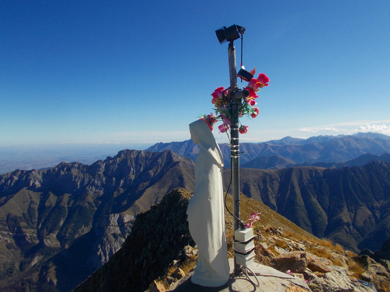 Si resta nei pressi di una cresta non molto delineata, aggirando alcuni affioramenti rocciosi (sono presenti molti bolli ed ometti). Negli ultimi 100 m di dislivello la pendenza si abbatte leggermente, in compenso la traccia non è più marcata, ma si sale con percorso libero fino alla statua della Madonna posta in vetta (c’è anche un faretto con pannelli solari ad illuminarla di notte)