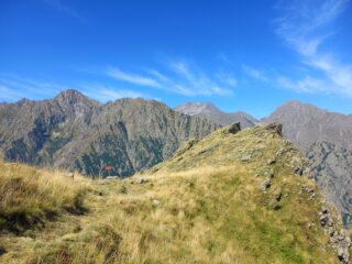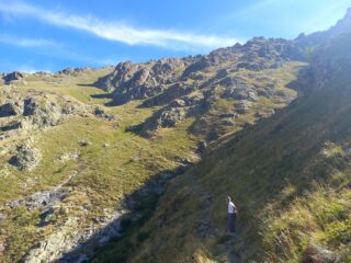 Da qui parte un bel sentiero recentemente decespugliato (grazie!) Fino al colletto, poi seguendo tacche e qualche ometto si hanno altri 750 d+ molto dritti e su vaghe tracce. Gita da non effettuare in caso di nebbia o su bagnato.