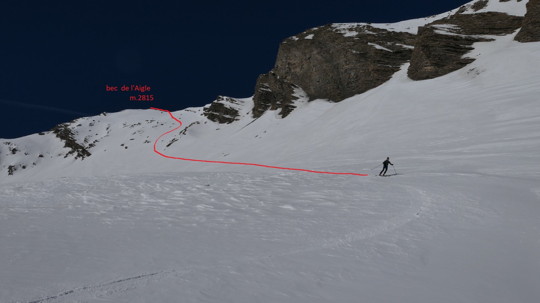Dall’abitato di Larche seguire il tracciato delle piste da fondo verso il Lauzanier e dopo aver superato la frazione di Malboisset si inizia a salire in corrispondenza di una radura verso il ripido lariceto fino ad incrociare il sentiero che rapidamente porta sul fondo del Ravin de Courrouit nel punto in cui questo si allarga.Dopo un tratto pianeggiante si supera sulla sx una rampa tra due avvallamenti fino a sbucare sul ripiano dove si trova la Cabane de Courrouit m.2162 e da qui dirigersi verso lo sperone N.E de Le Germas e contornarlo a dx per entrare nel Vallon Bernard e seguirlo sul fondo dirigendosi verso il col Bernard situato tra Le Germas e il Bec d’Aigle .Giunti sotto il pendio est di quest’ultima risalirlo (30°) fino a raggiungere la panoramica cima.Discesa per l’itinerario di salita oppure in boucle scendendo nel Vallon de Font Crese per ritornare a Larche.