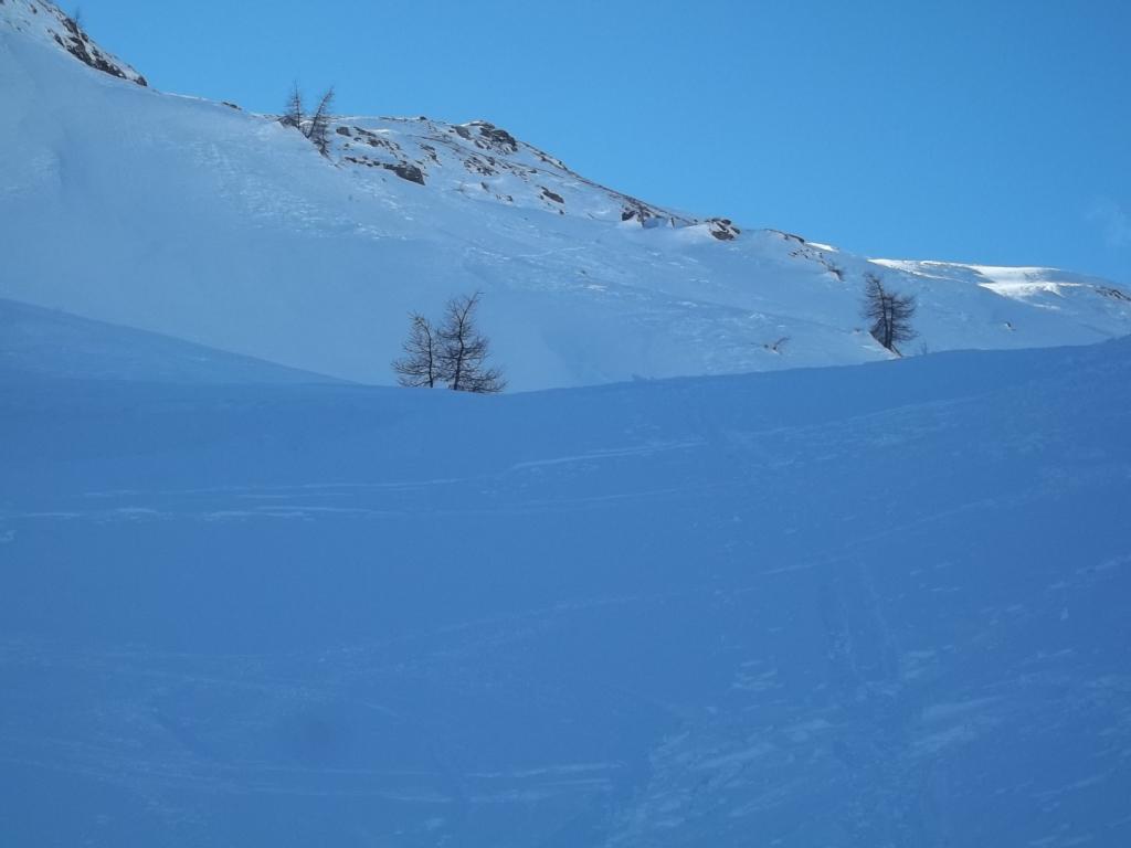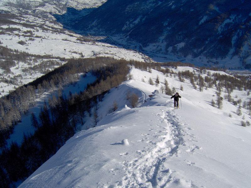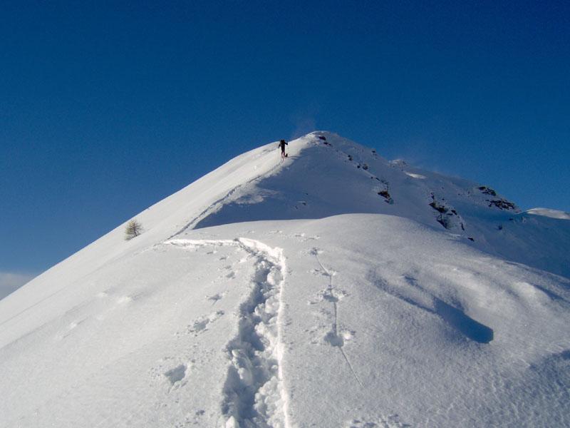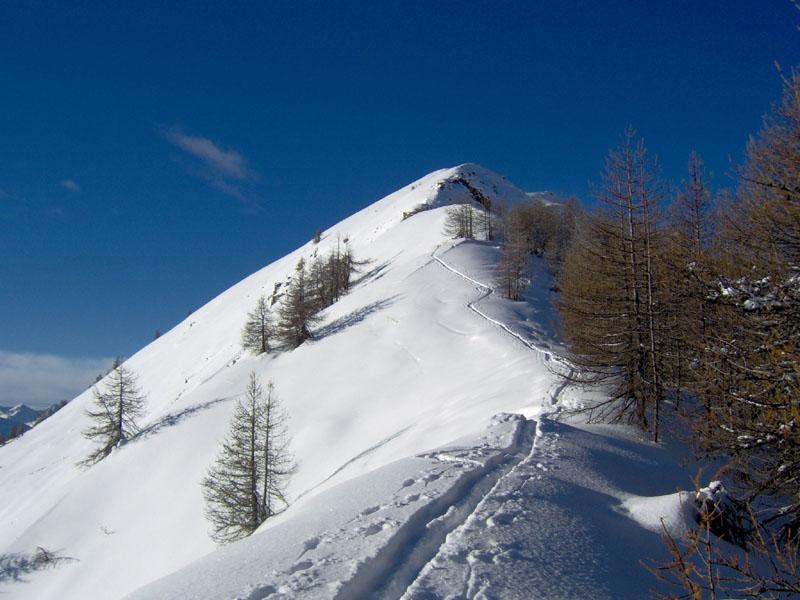 Si sale nel bosco di larici cercando di tenere il filo della cresta all’inizio piuttosto ampio. Si attraversa una pista forestale e si prosegue in direzione SO, fino a uscire dal bosco. Si segue allora il filo di cresta superando un salto un po’ più impegnativo.
