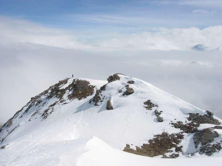 Malgrado le apparenze ci siamo fidati delle previsioni. Abbiamo fatto bene! Alla partenza nebbia fitta e qualche fiocco di neve. Poi, per almeno un’ora, solo nebbia fitta. Arrivati sulla dorsale il sole ha iniziato a farsi vedere e, seppure in un contesto prevalentemente nuvoloso, ci ha accompagnati per il resto della giornata. Per questo, ma anche perchè la gita è veramente bella, avrei dovuto dare 5*, ma la neve era talmente schifosa in tutte le sue variabili, anche se prevalentemente marcia e collosa, che ho già fatto uno sforzo a darne tre. Siamo partiti da Duc, e poi siamo saliti nella nebbia seguendo cartina, bussola e istinto. La cresta è bella e divertente, senza problemi salvo il primo risalto roccioso dove è opportuno togliere le racchette. La cresta è anche il tratto con la neve migliore, anche se presenta tratti spelacchiati causa il vento. Con Marisa e Fausto.