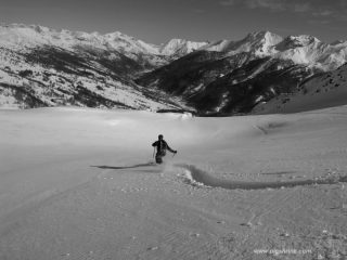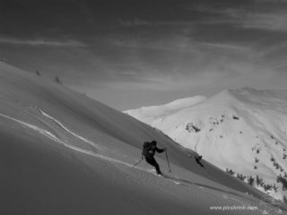 Siccome so accontentarmi, e al Pitre solitamente Mark mi porta quando c’è bufera…aggiungo una stella, e poi per la Costa Zalet (BS) è un’altra cosa;-)) Dopo alcuni metri dalla cima un pò pelati pendii intonsi da non credere ed un solo passaggio prima di noi. Bellissima