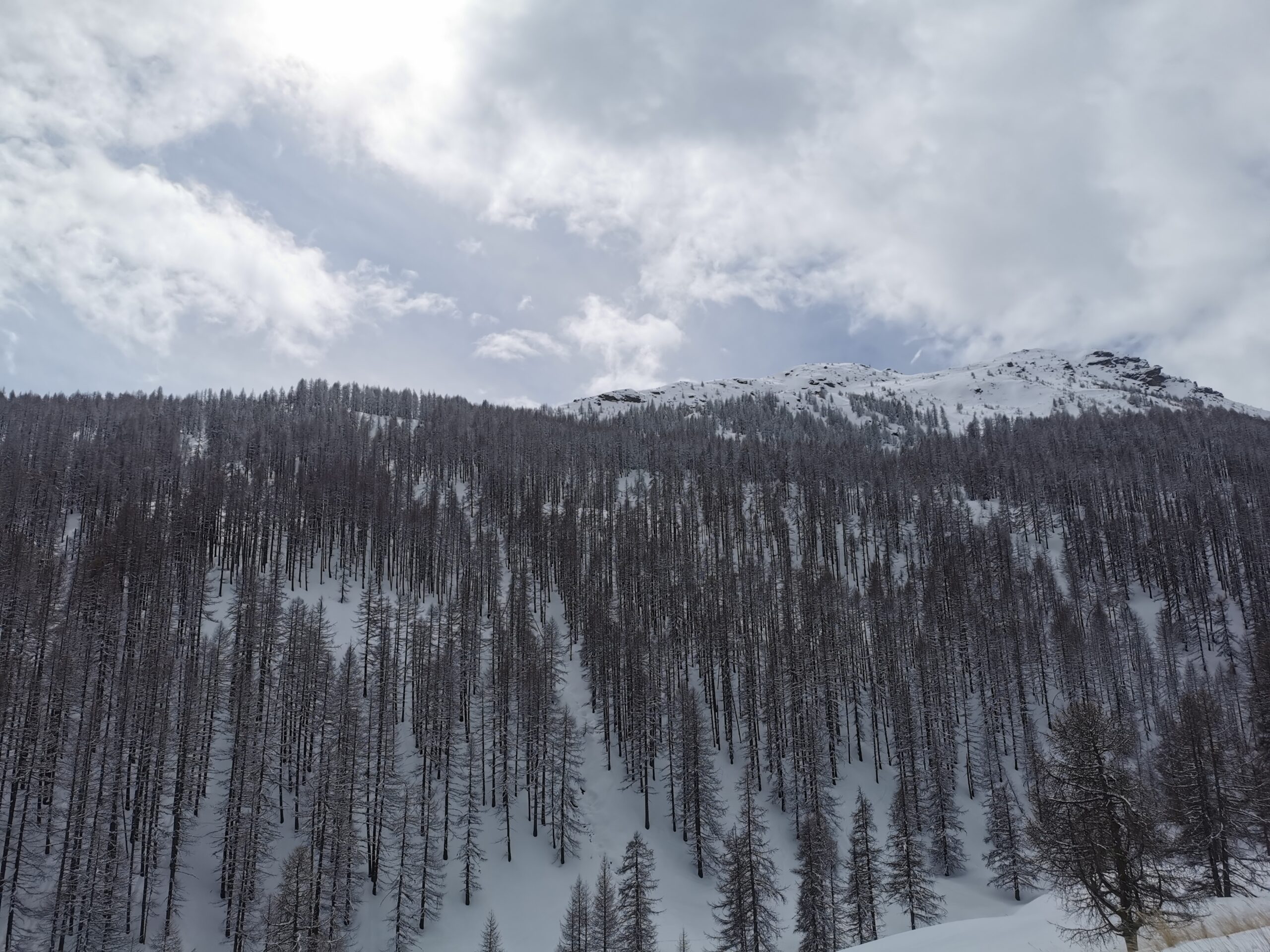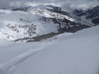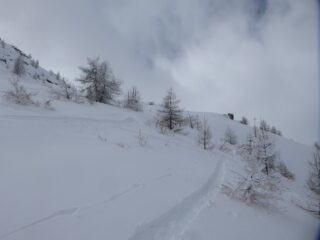 bel giro dopo la nevicata, alla partenza 10 cm scarsi di neve nuova, dal bivio in su circa 30-40 anche più a tratti, in alto il vento ha iniziato a fare qualche accumulo. Discesa diretta dalla valletta a sinistra della Costa Zalet e poi verso i 2300 diretto nel bosco fino a tornare al vallone a quota 2040 circa, bella variante divertente, con tratti di neve ancora fredda, poi sulla strada un poco bagnata ma ancora decente..a breve non sarà più così
