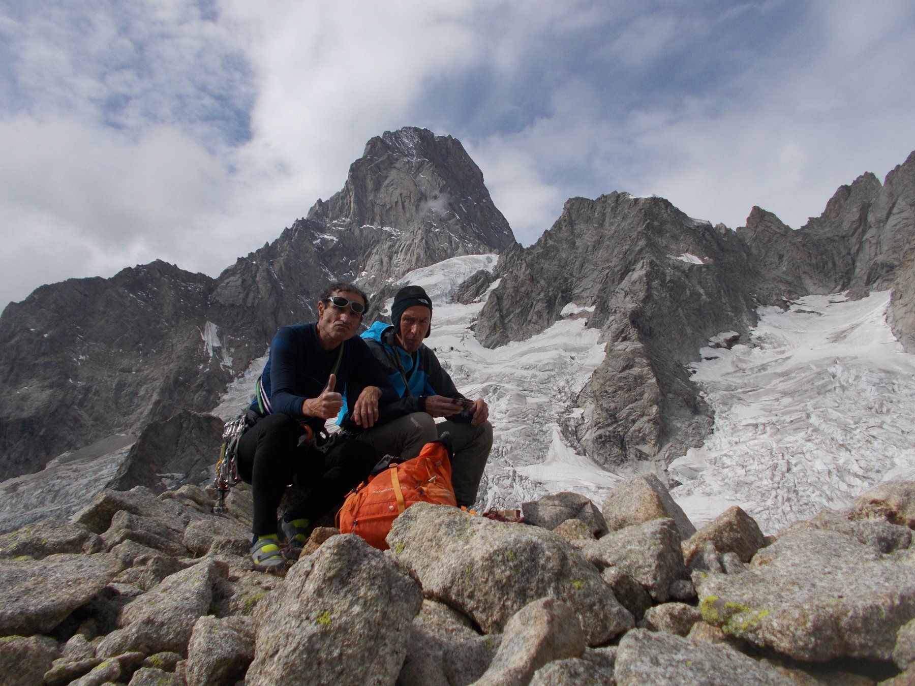 Noi abbiamo attaccato alla base del gran diedro per una placca di 5c con un passo di 6a a meta’, fino a una sosta all’interno del diedro. Impensabile attaccare il muro di 6b di poco piu’ a dx quantunque ben spittato senza un minimo di preriscaldamento. Non va dimenticato che il tracciato pur avendo tutti i connotati di una via da falesia, e’ stata concepita e realizzata in ambiente d’alta montagna, particolarmente severo all’ombra delle Jorasses, con la vetta che sfiora i 3000m., e corde fisse come per accedere al bivacco, cosi anche per l’attacco della via, un approccio nell’insieme complesso e a dir poco faticoso.